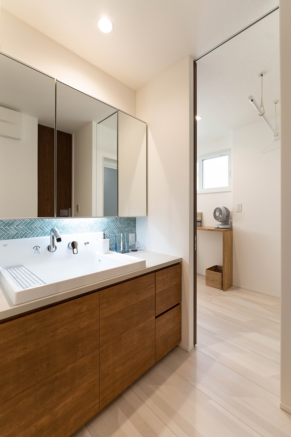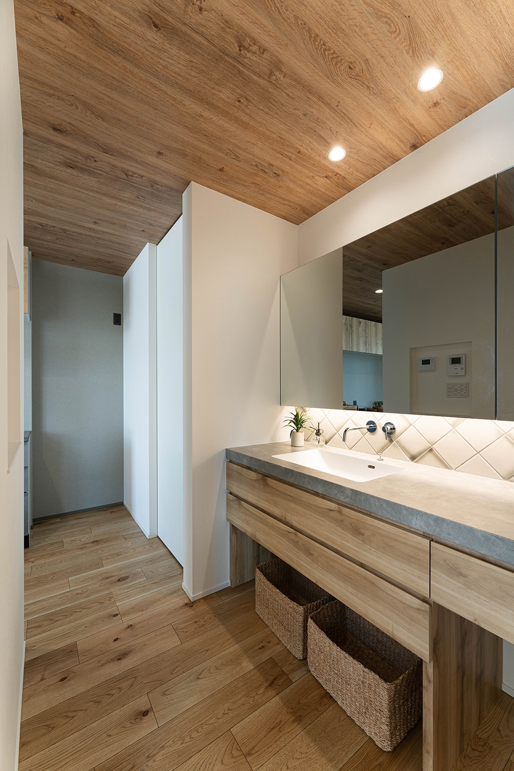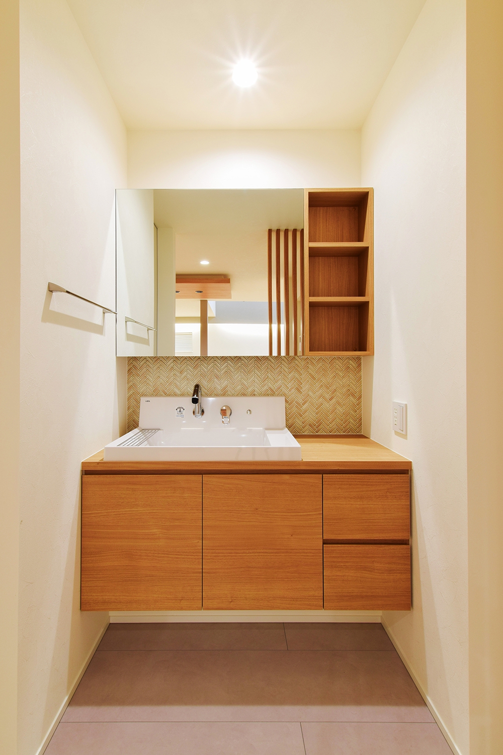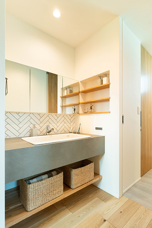 家族が並んでも使える広々造作洗面台は、木目とヘリンボーン貼りにしたグレージュのタイルで洗練された空間に