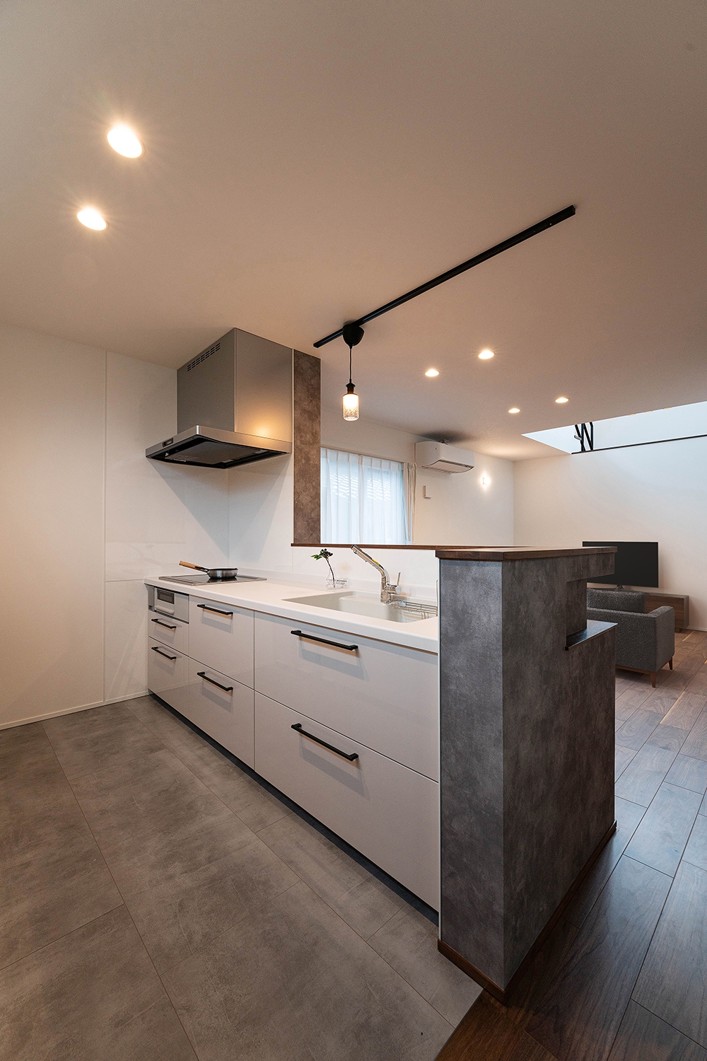 立ち上がりがなく、開放感のあるオープンキッチン。腰壁や背面など、異なるトーンのグレーがメリハリを効かせ、三連のペンダントライトが空間を彩る