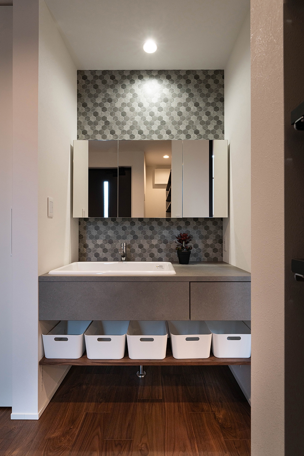 上部まで大胆にヘキサゴン柄のタイルをあしらった造作の洗面化粧台