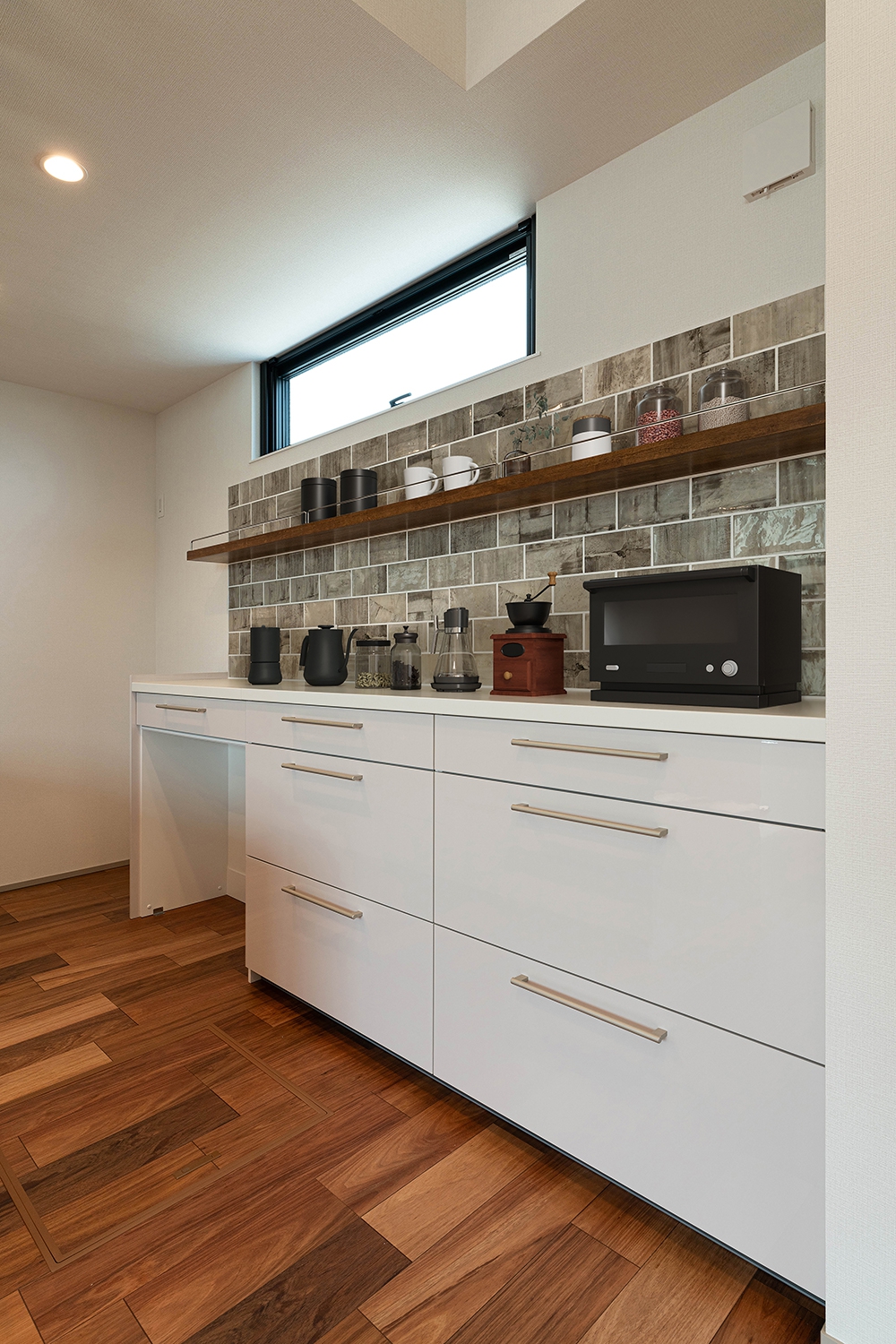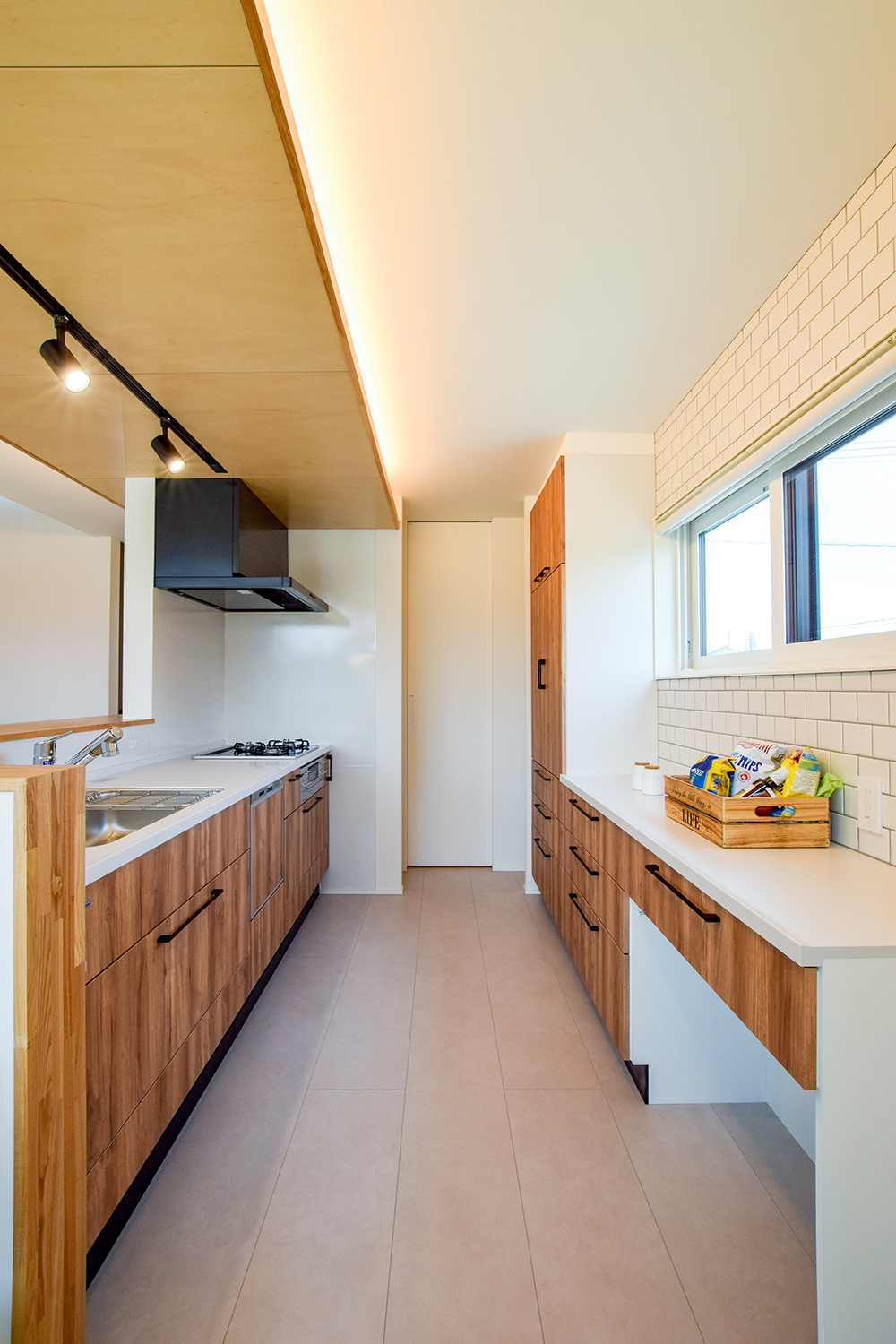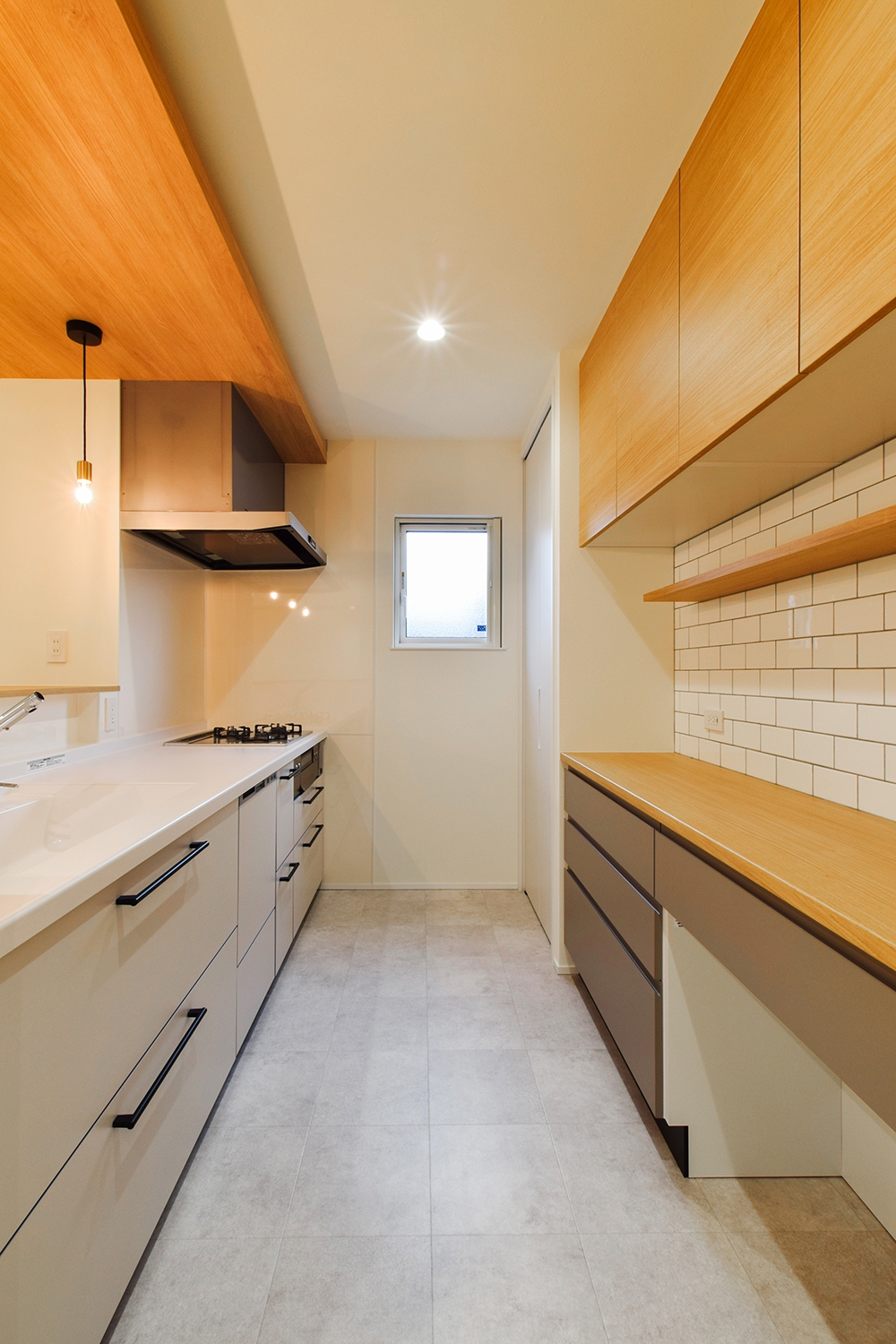 白いタイルと木目の組み合わせが魅力的なキッチンは、収納力もあり、日常の使いやすさに配慮した