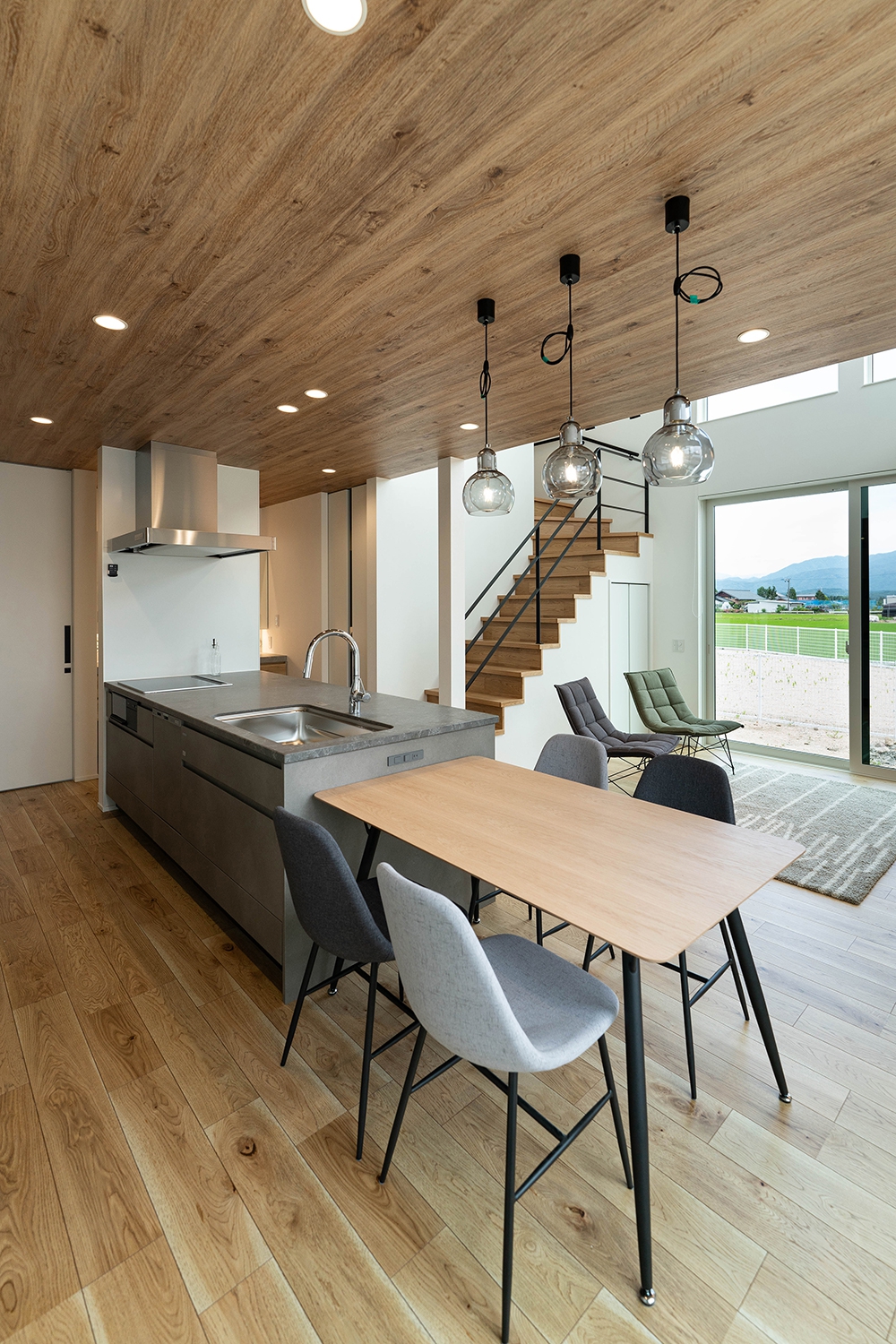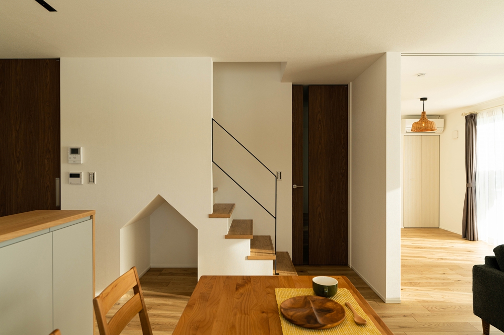 木の温もりに包まれた、吹抜け階段のある開放的なダイニングキッチン。スリット天井と間接照明が空間に奥行きを与え、心地よい暮らしの中心に