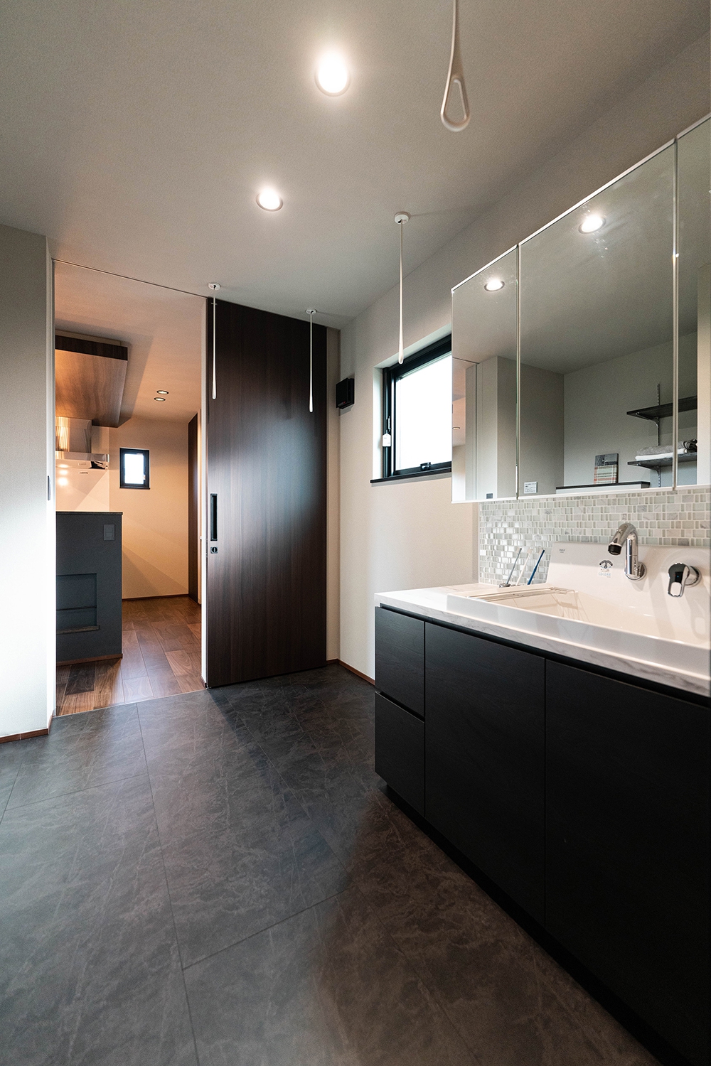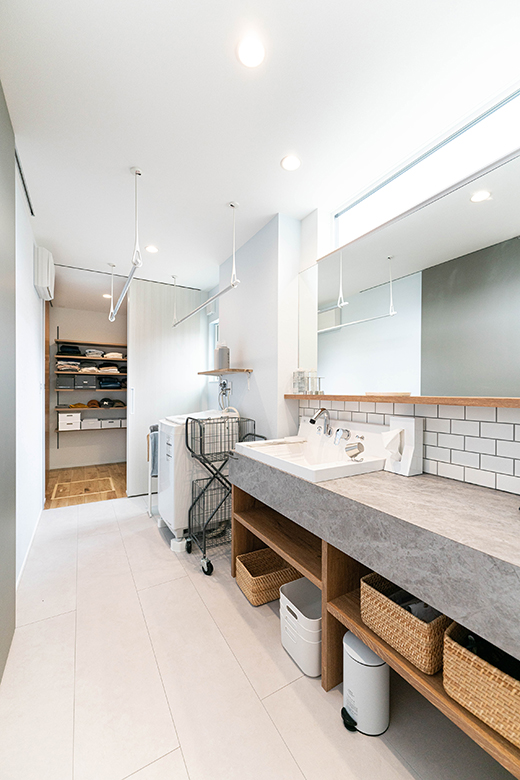 洗面・脱衣・ランドリー・浴室が一直線に並ぶ、効率重視の家事動線。スタイリッシュな洗面台と乾太くんを備えた空間で、毎日の家事がより快適に