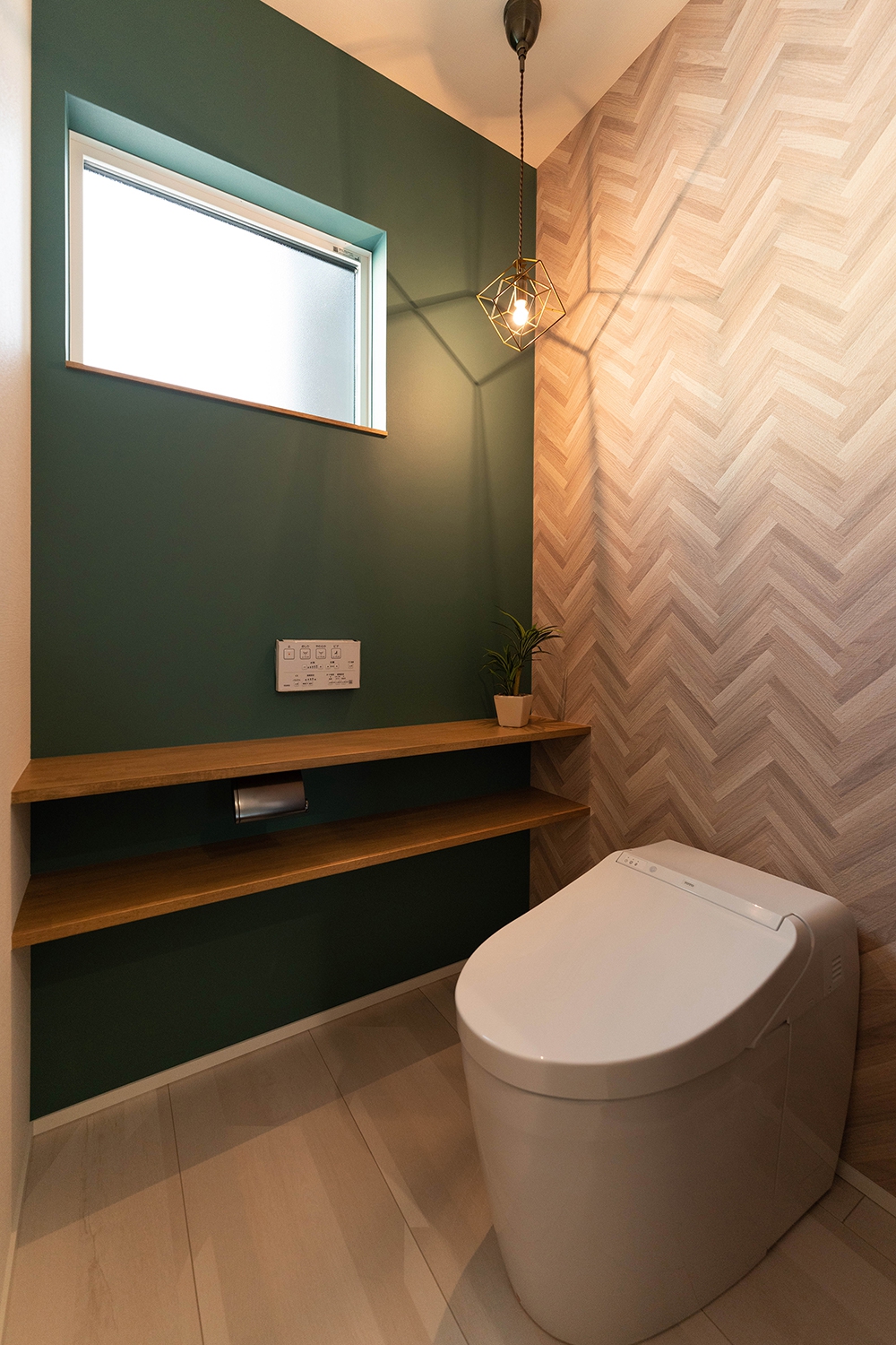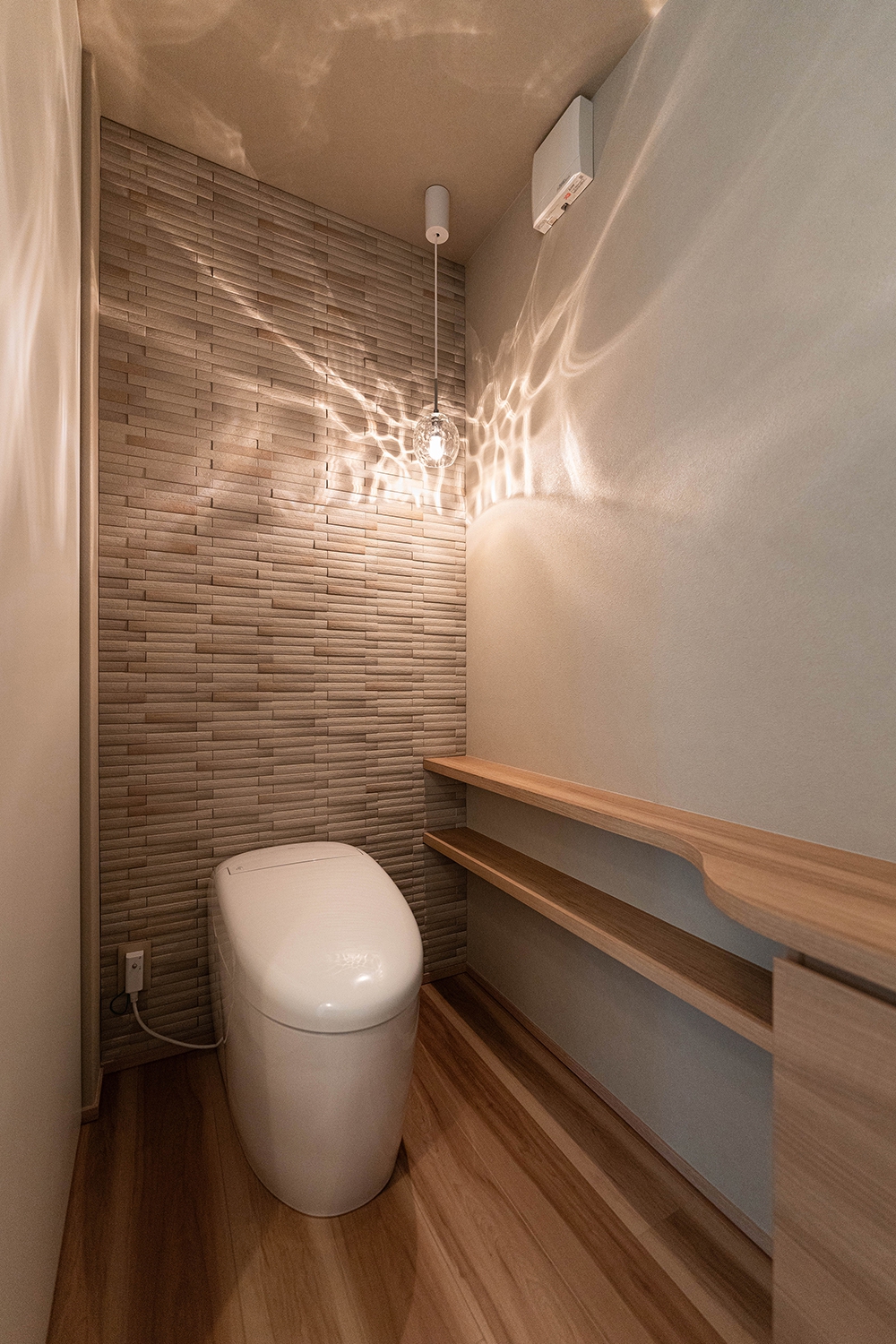 間接照明で落ち着いたトイレ。木目調の収納を採用し、家全体のトーンと合わせた