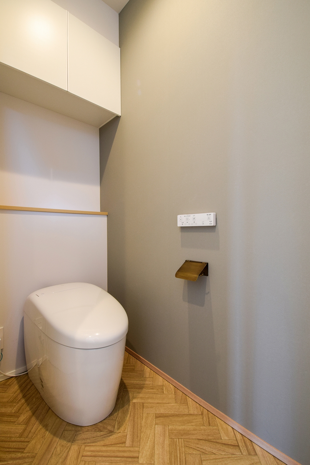 間接照明で演出したグレーとヘリンボーンの床の1Fトイレ