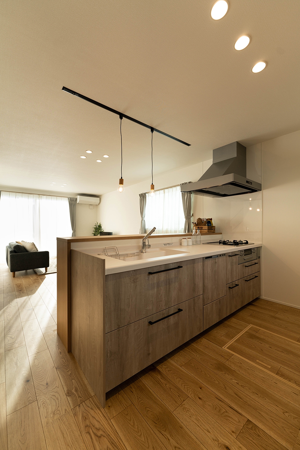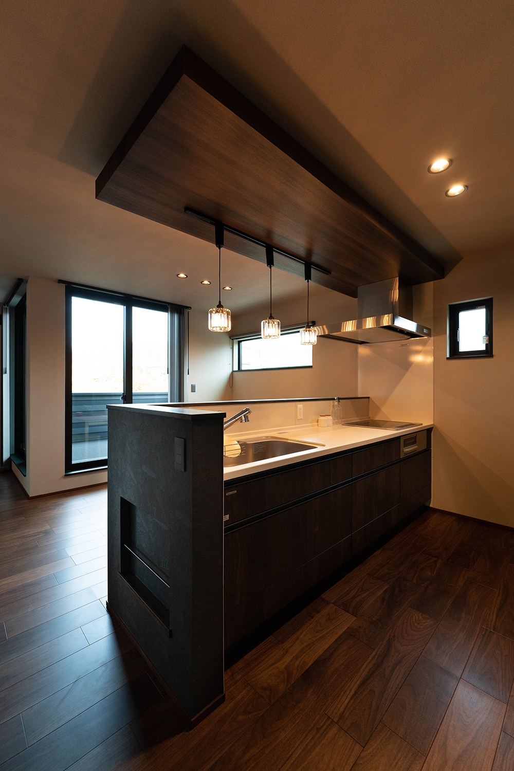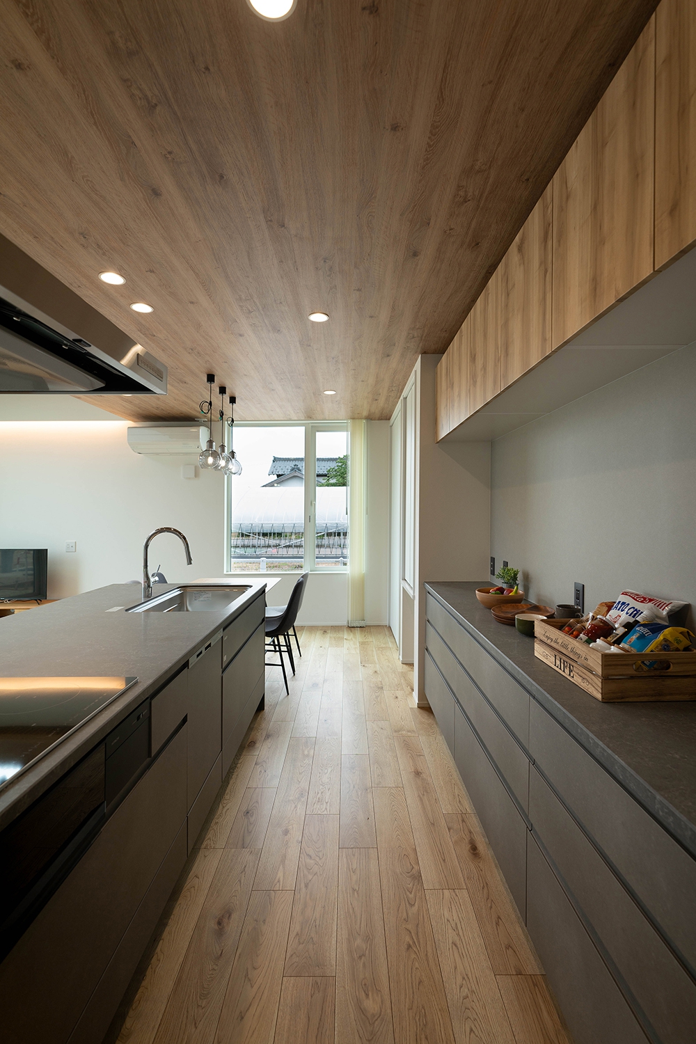 木目天井に沿った間接照明がキッチンスペースを柔らかく包み込み、落ち着いた雰囲気を。ダークトーンのキッチンキャビネットとナチュラルな木の質感が調和し、洗練された大人の空間を実現