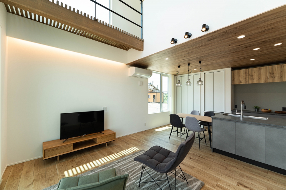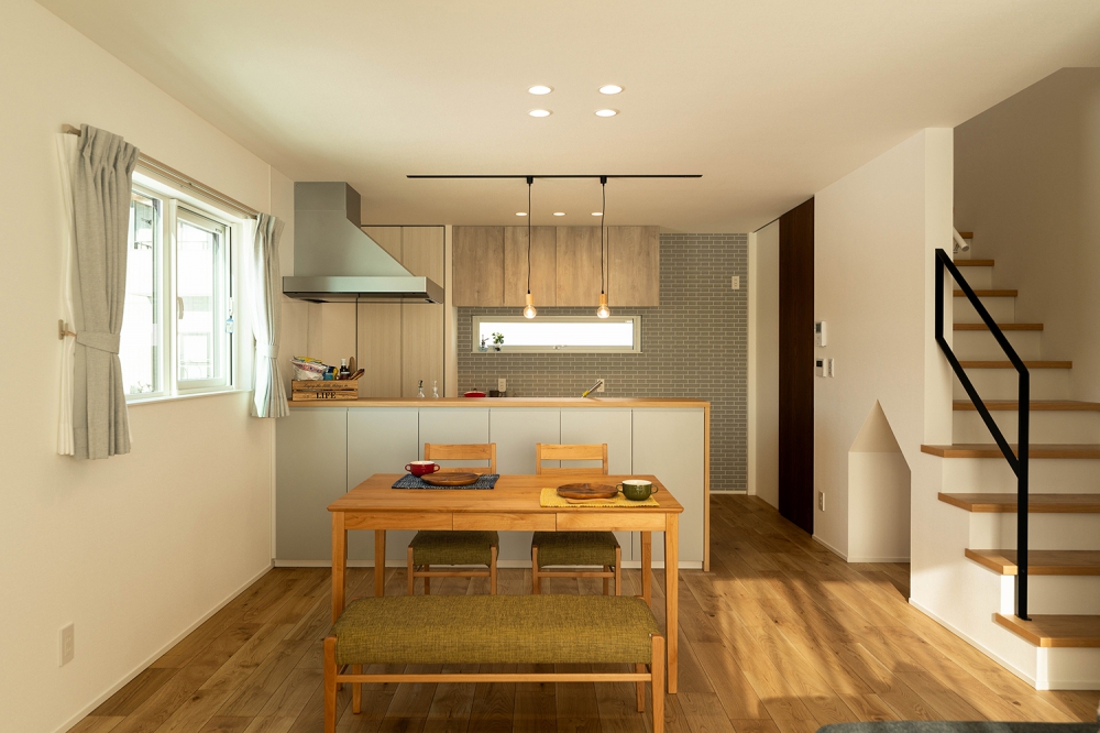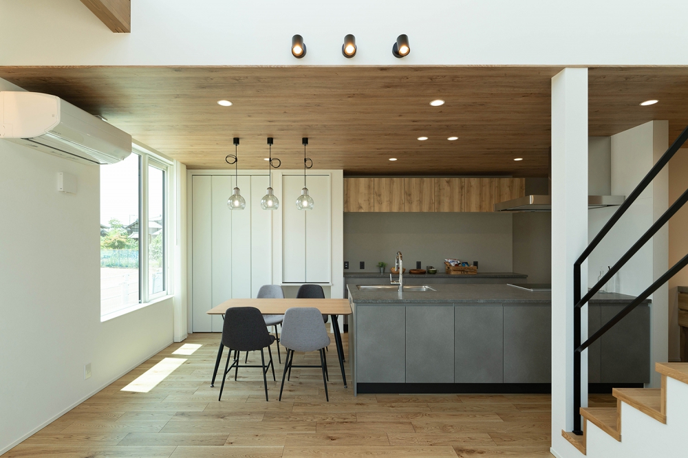 2階に位置するリビング・ダイニングは、木の温もりが感じられる広々とした空間。キッチンにはヴィンテージ調のタイルと格子状の天井アクセントが設けられ、スタイリッシュな雰囲気を演出
