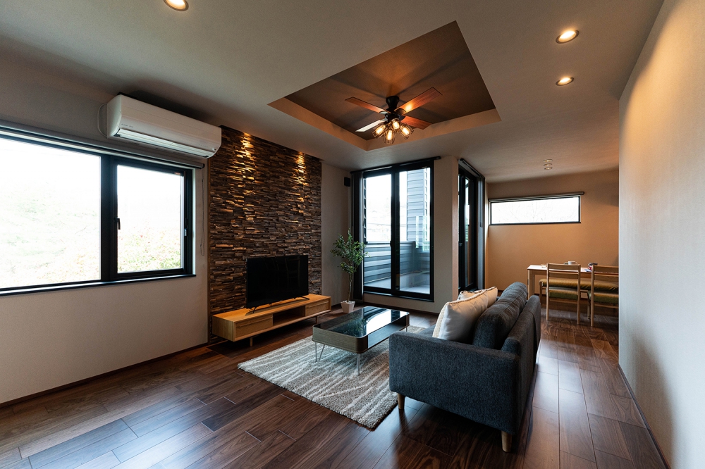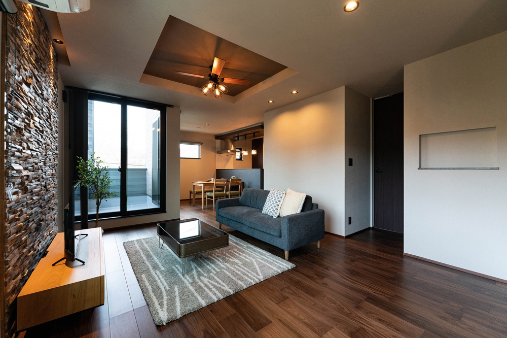 TV台背面には素材を変えたアクセントウォールを設けることで高級感漂う質感により大人の寛ぎ空間に