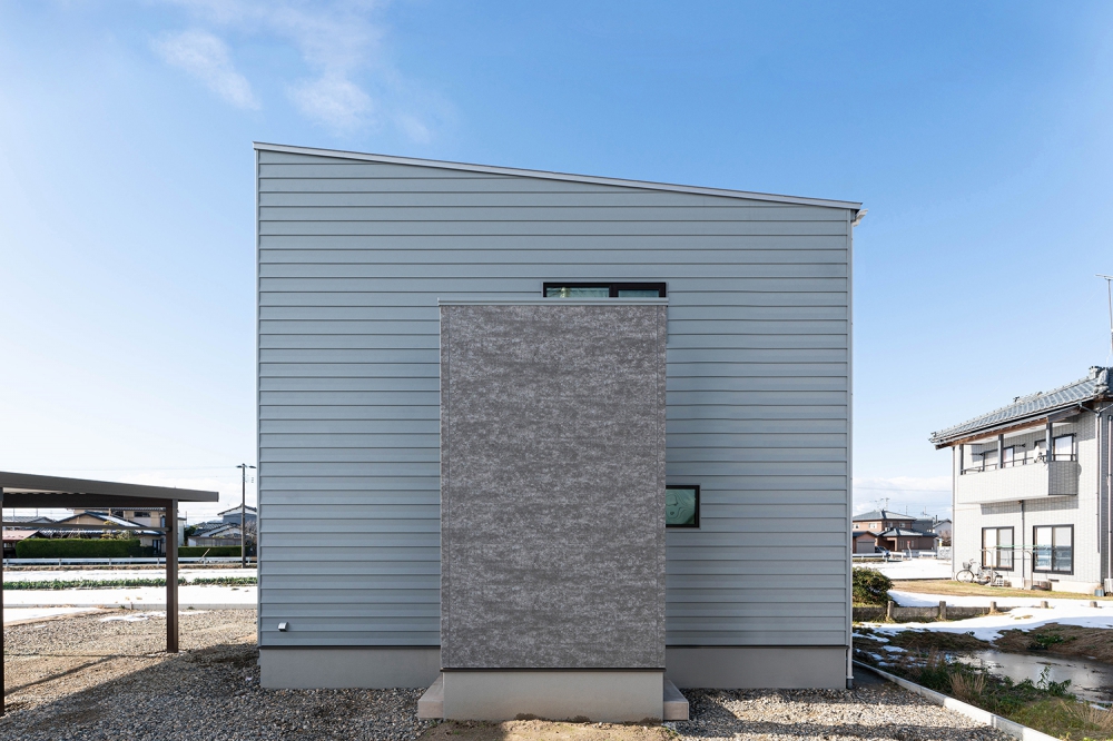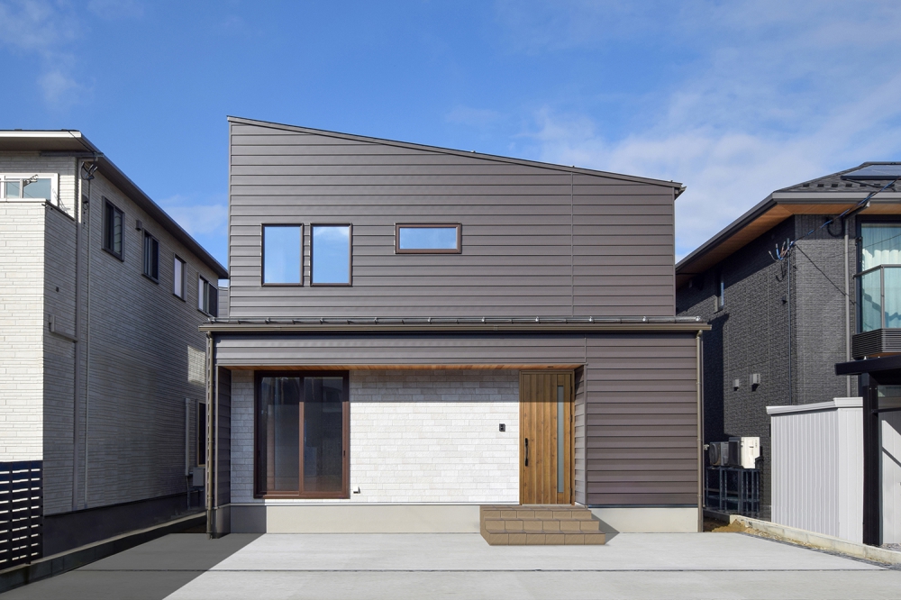 豪雪地域に対応した落屑屋根。正面の窓配置を整えるためにアクセントの外壁を枠で囲ってラインをそろえた