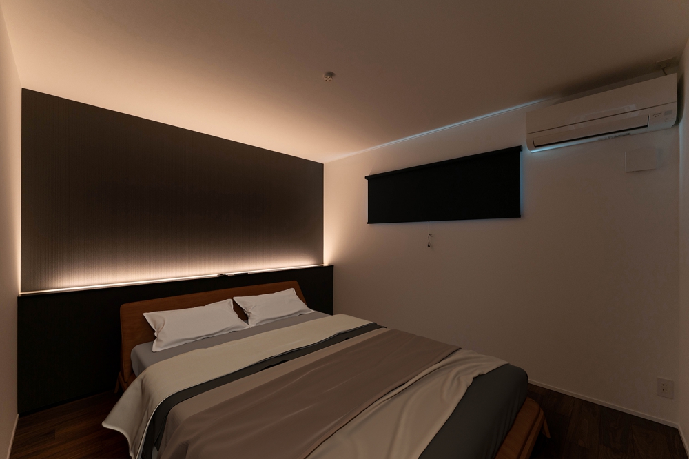 寝室は柔らかい間接照明の光で癒しの空間に。壁材にKMEWの内装材、SOLIDO、コーヒー豆の材料を使い、消臭効果も