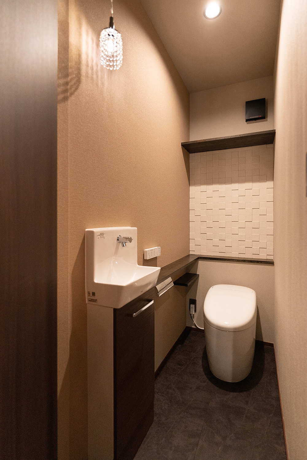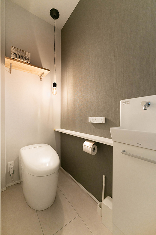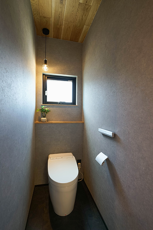 ダークトーンでまとめたトイレ空間。壁には質感のある素材を使い、シンプルながらも上質な雰囲気が漂う