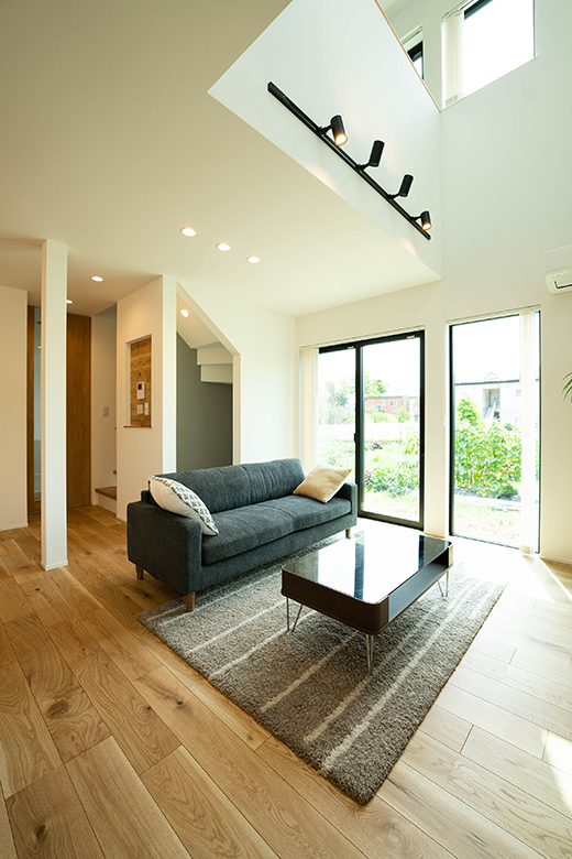 リビング上部は吹き抜けになっており、2階窓から1階へ日差しが降り注ぐ。