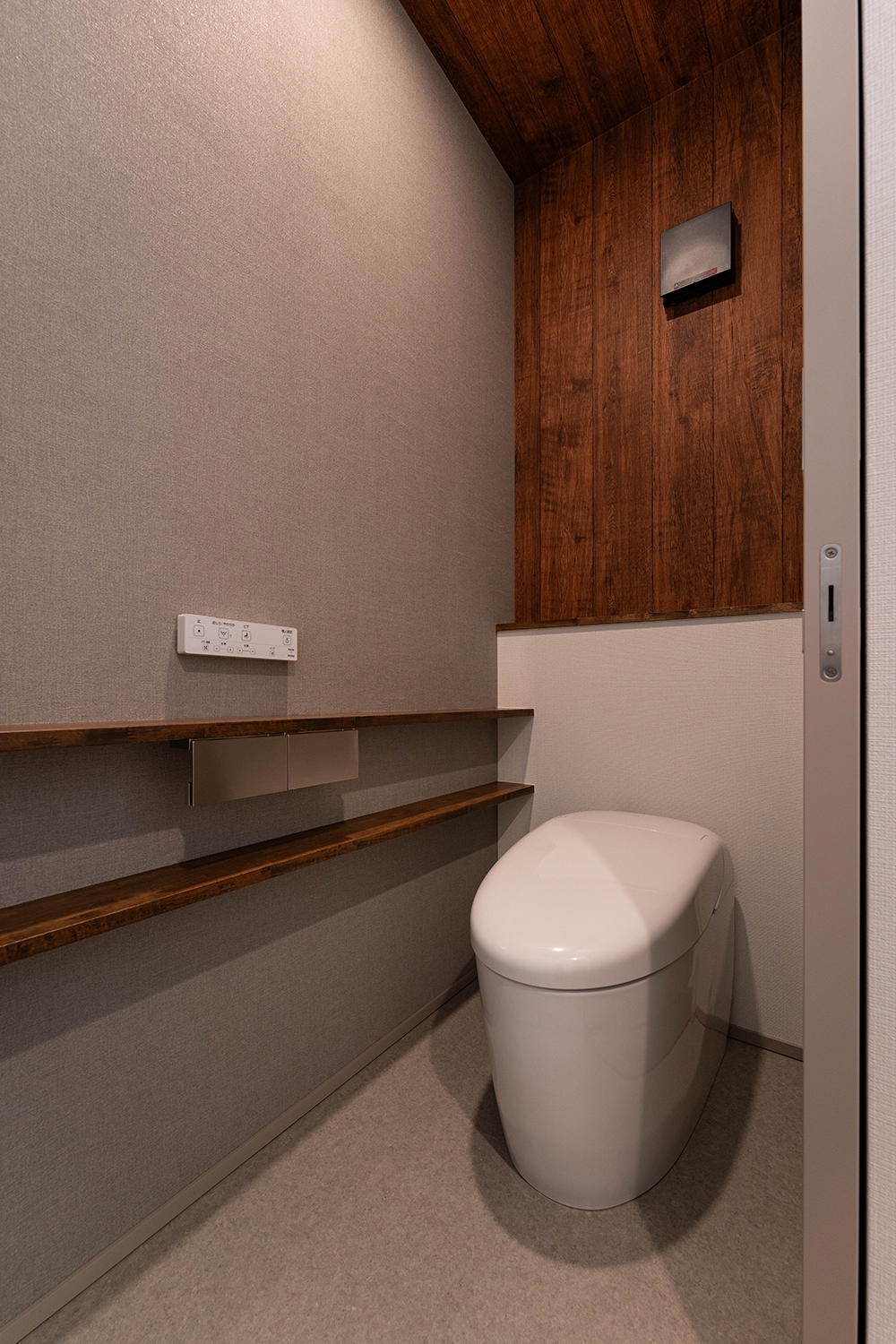 トイレは、木目調のアクセントウォールと天井が居心地の良い空間に。落ち着いた色合いと質感が調和し、上質な雰囲気を演出