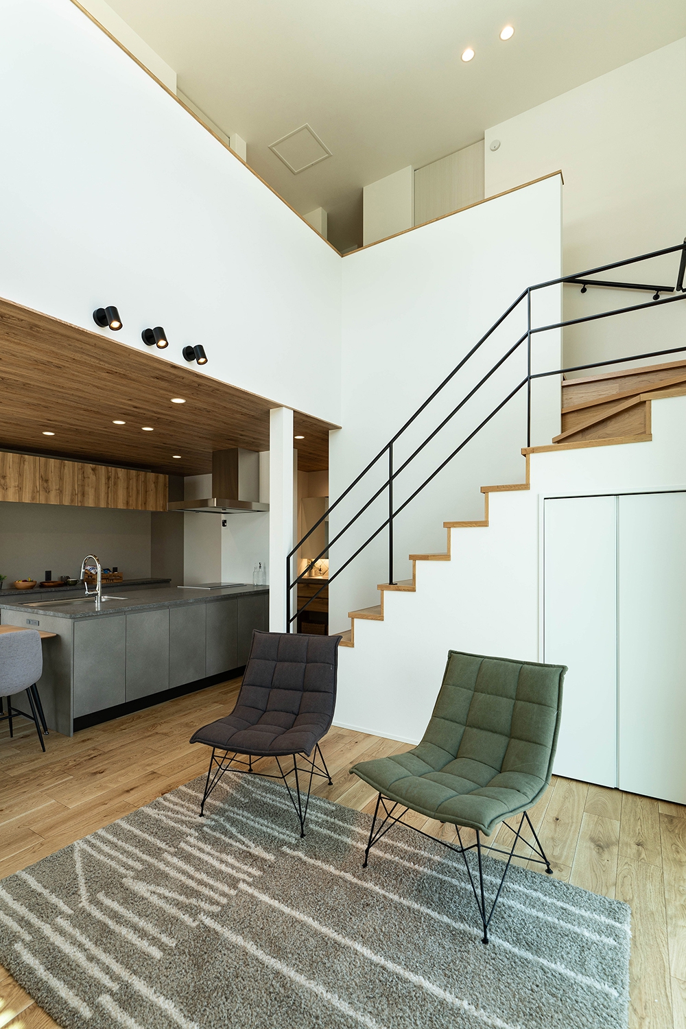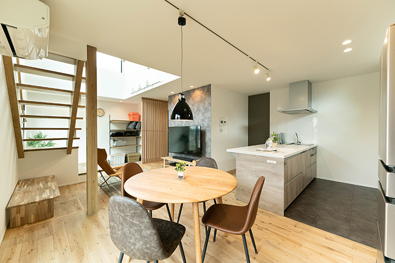 23帖LDKには、吹抜けと木製スケルトン階段にアイアン手すりを採用することで、開放感あふれる空間となった