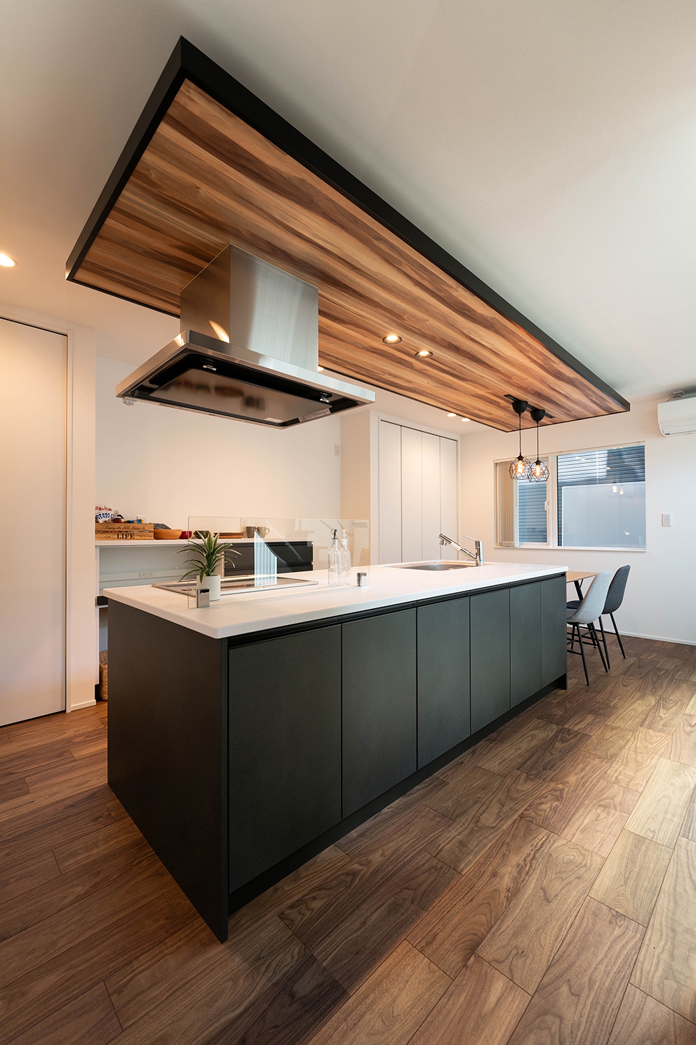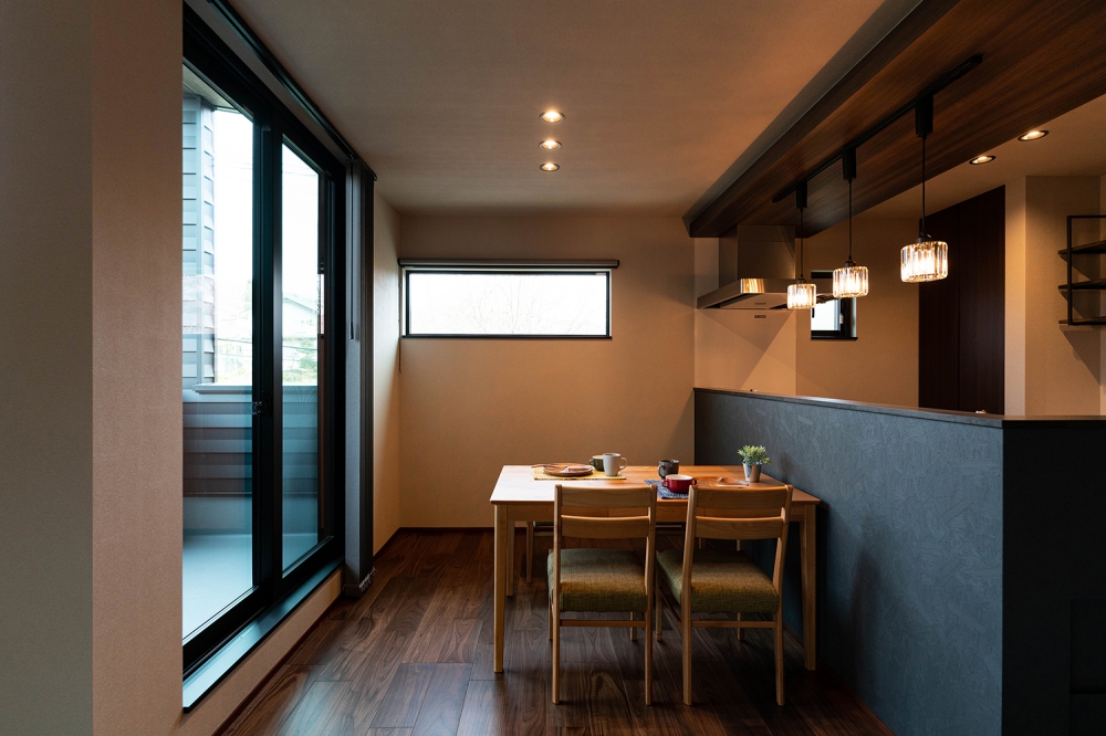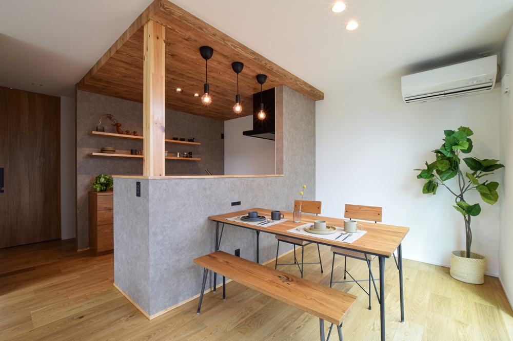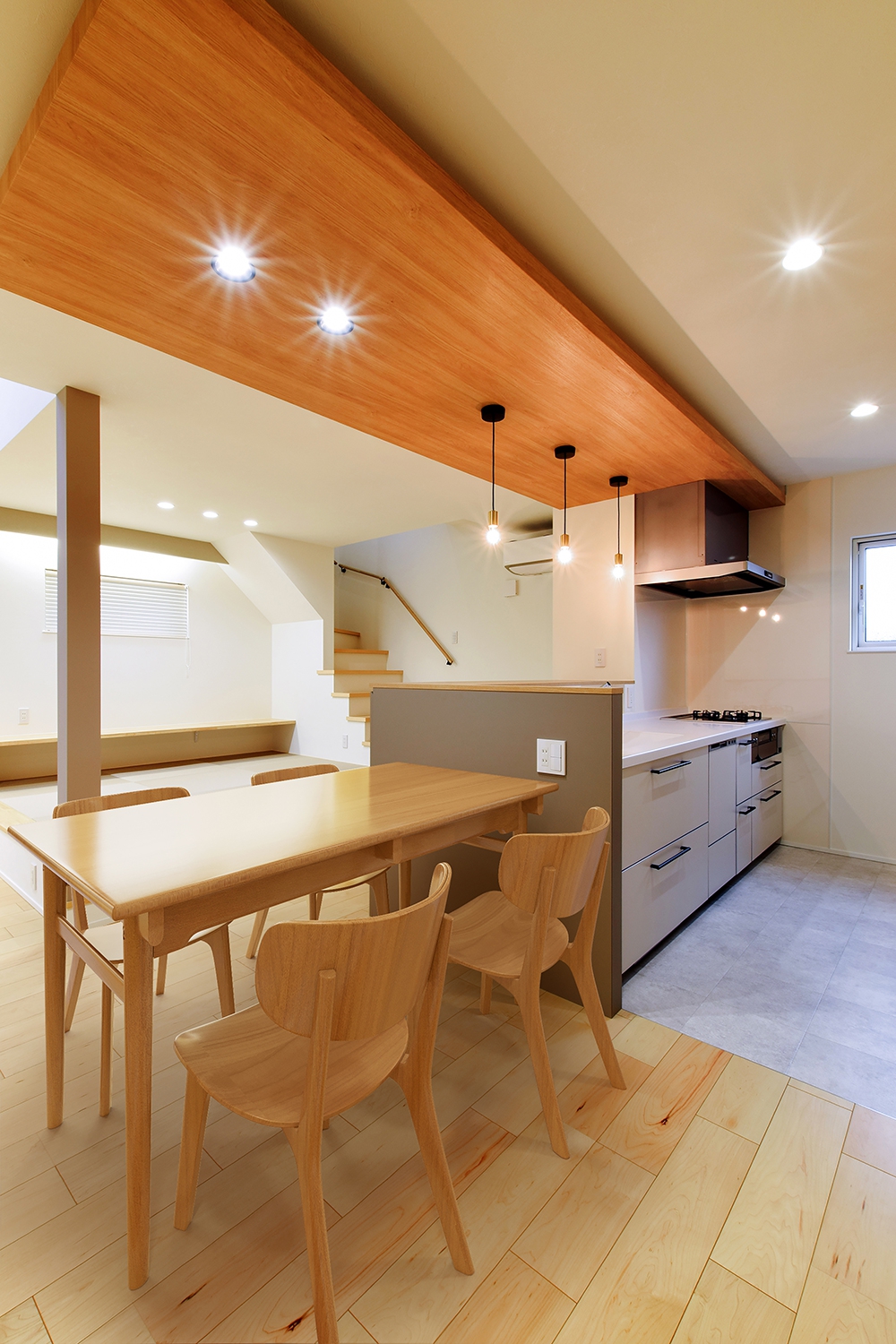 木目調の天井と間接照明が調和したダイニングキッチン。ペンダントライトがダイニングテーブルを優しく照らし、家族や友人との会話が弾む心地よい空間