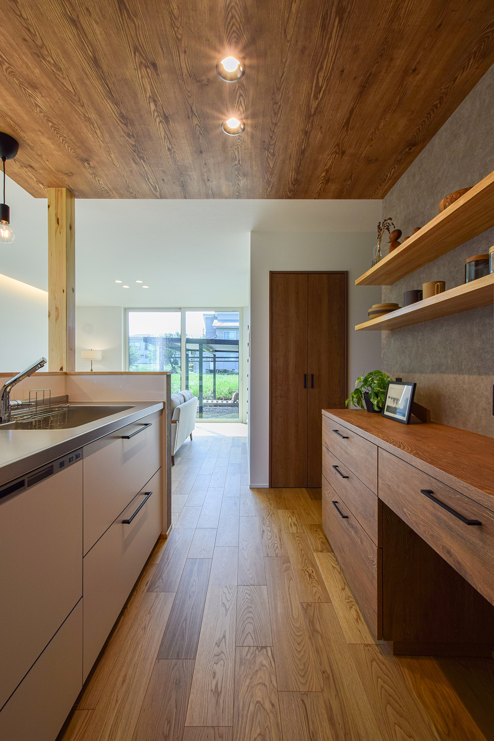 床や天井の木目色を統一した造作カップボードが印象的なキッチン空間