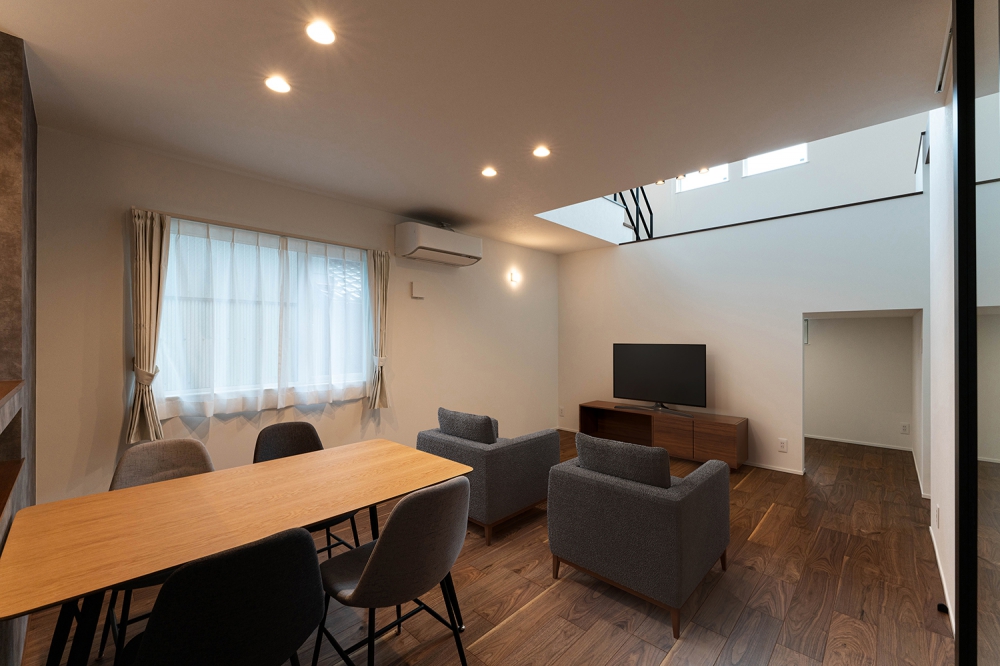 吹抜けのあるリビングが開放感を生み、光が差し込む心地よい空間。キッチン、ダイニング、リビングがひとつながりになったレイアウトで、家族が自然に集まり、コミュニケーションが取りやすい設計
