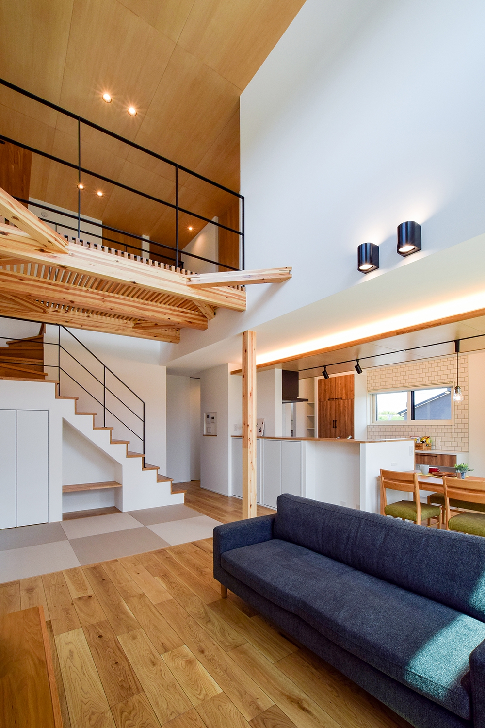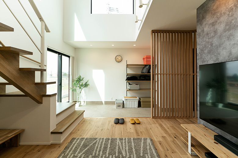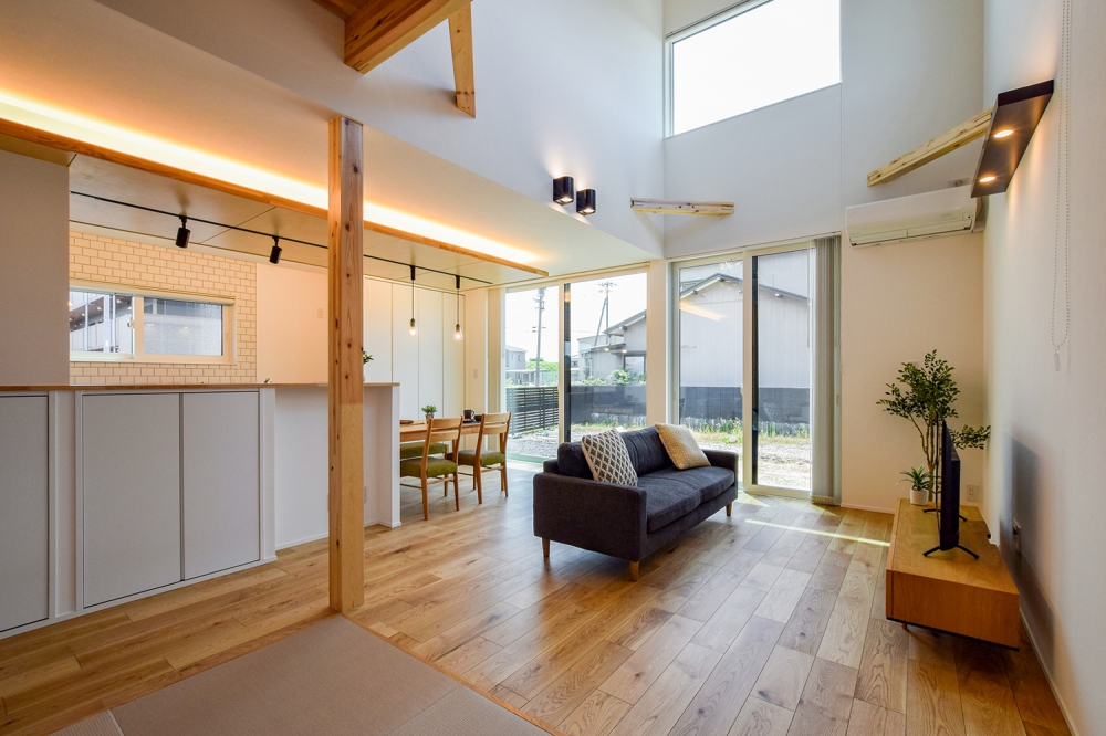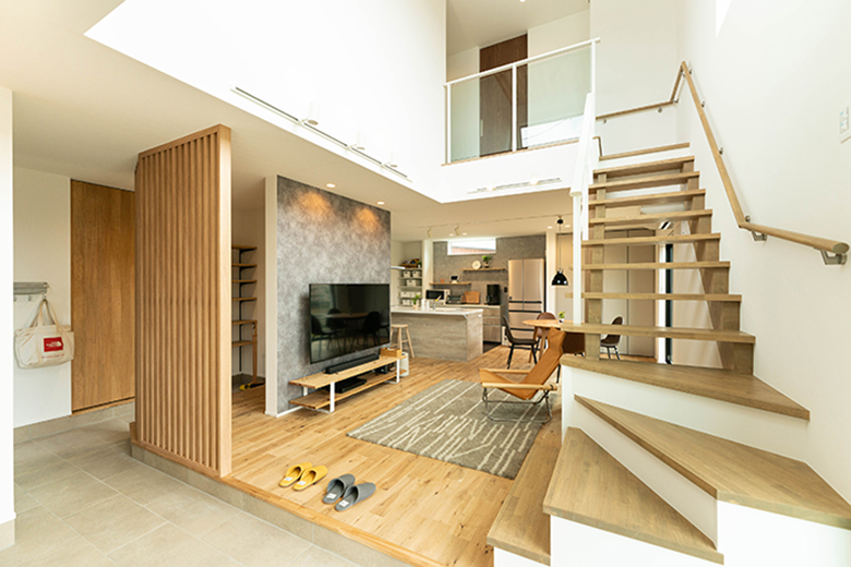 吹抜けのあるリビングと小上がりの和室が融合した開放感あふれる空間は、家族が自然と集まる憩い場に