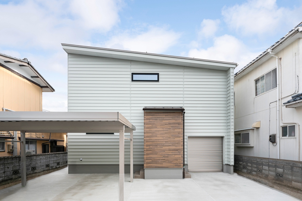 淡い色合いのガルバリウムに、木目調の壁が温かみをプラスした外観。直線的でミニマルな美しさが、ひと際目を引く