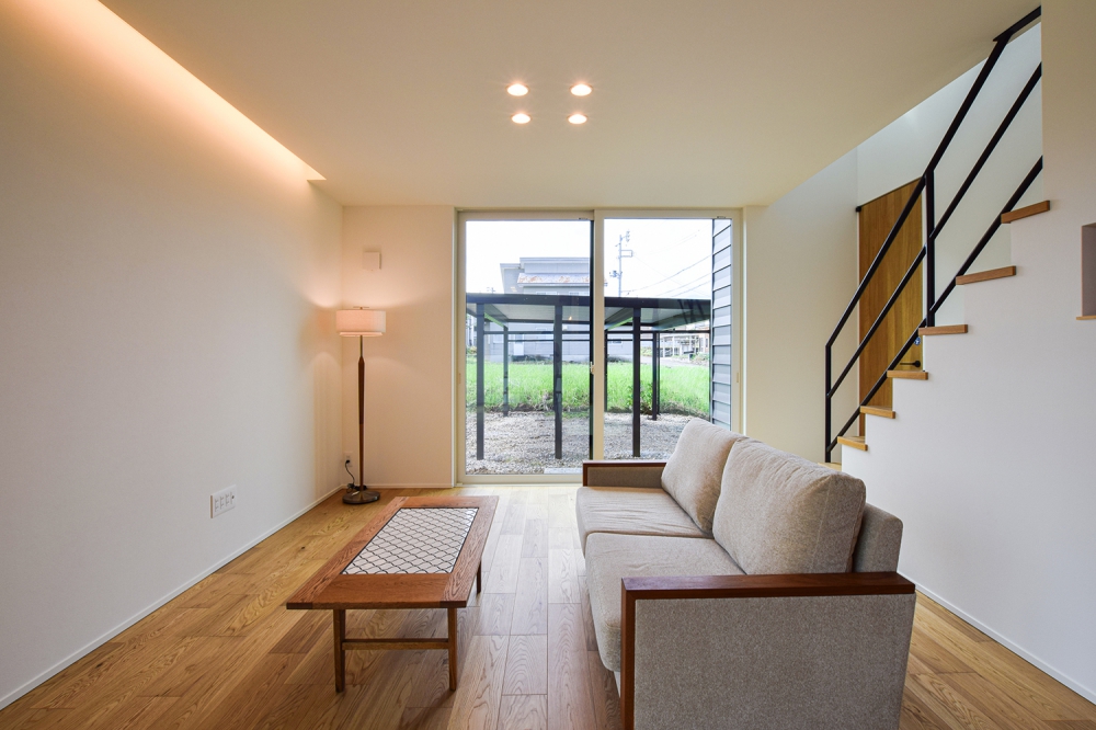 26坪コンパクトハウス 吹抜け+スケルトン階段+フルハイトドアで大空間に