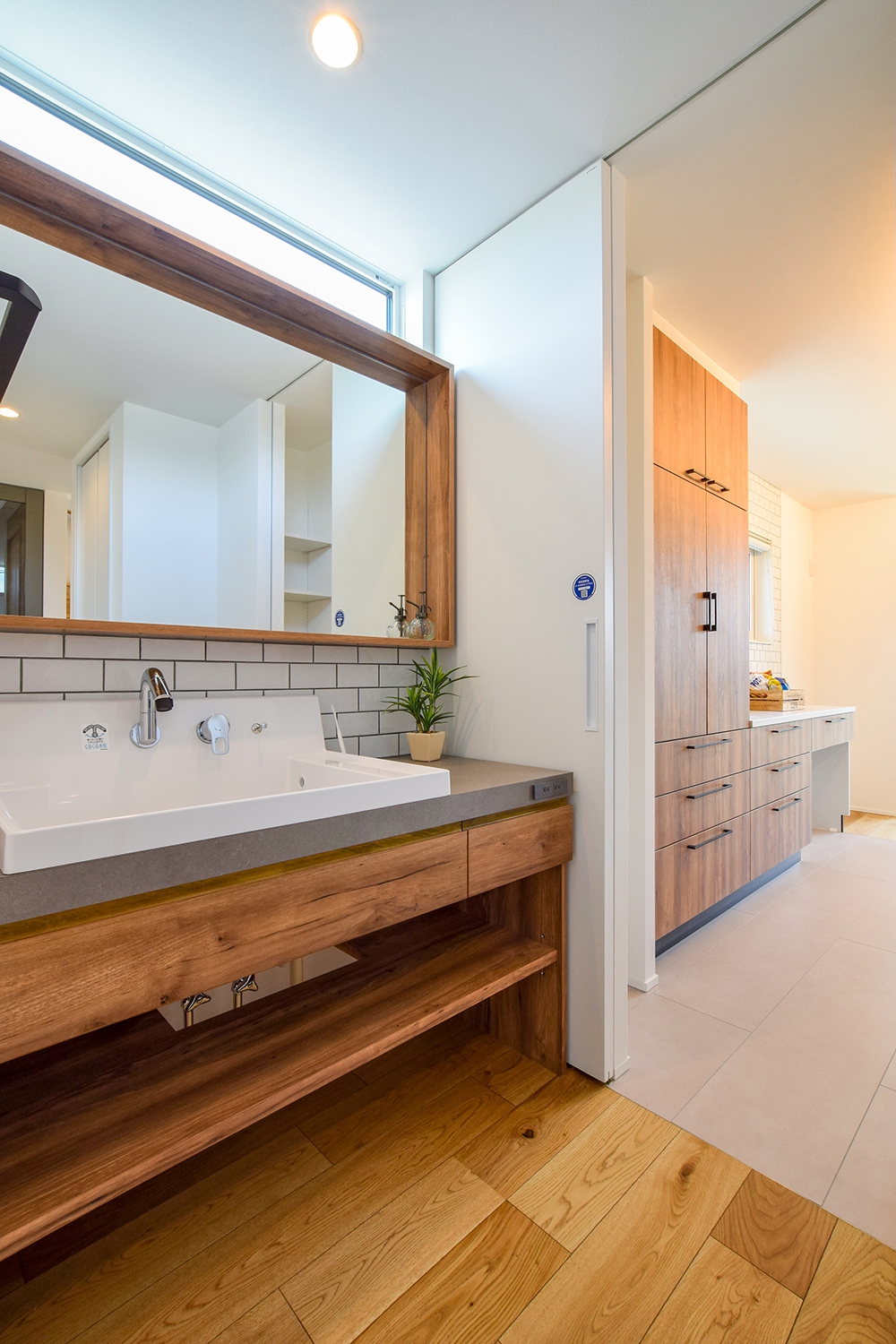 ナチュラルな木目のキャビネットとシンプルなデザインが特徴の洗面スペース