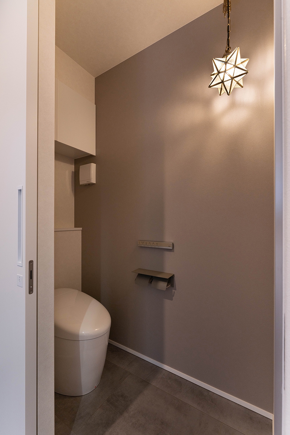 1階トイレは片側の壁にグレーのアクセントクロスを貼り、星型のペンダントライトがよく映える