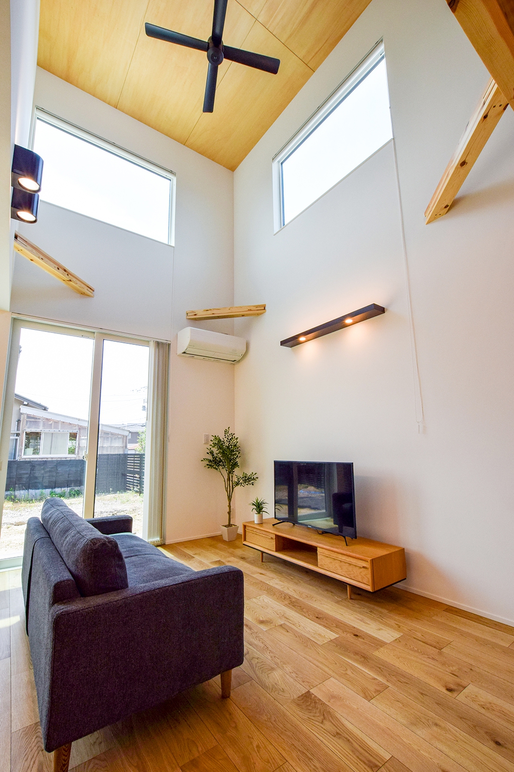 リビングには吹抜けを設けて高窓を配置。空に向かって視線が抜け、開放感を味わえる