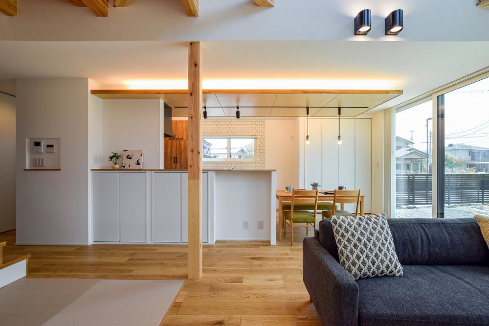 温もりある木目の床と間接照明が心地よいリビング空間。リビングの奥には小上がりの和室が配置され、くつろぎのスペースが広がる