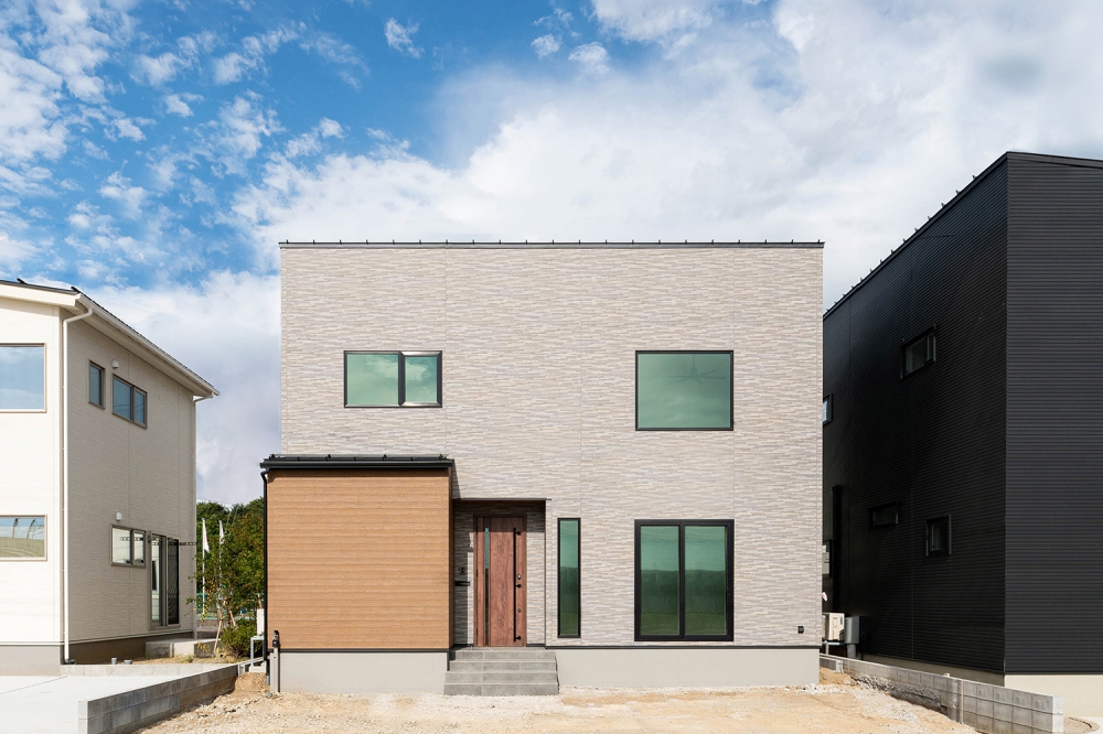 軒の出が印象的なスクエアな外観。内枠は木目で統一しアクセントとした
