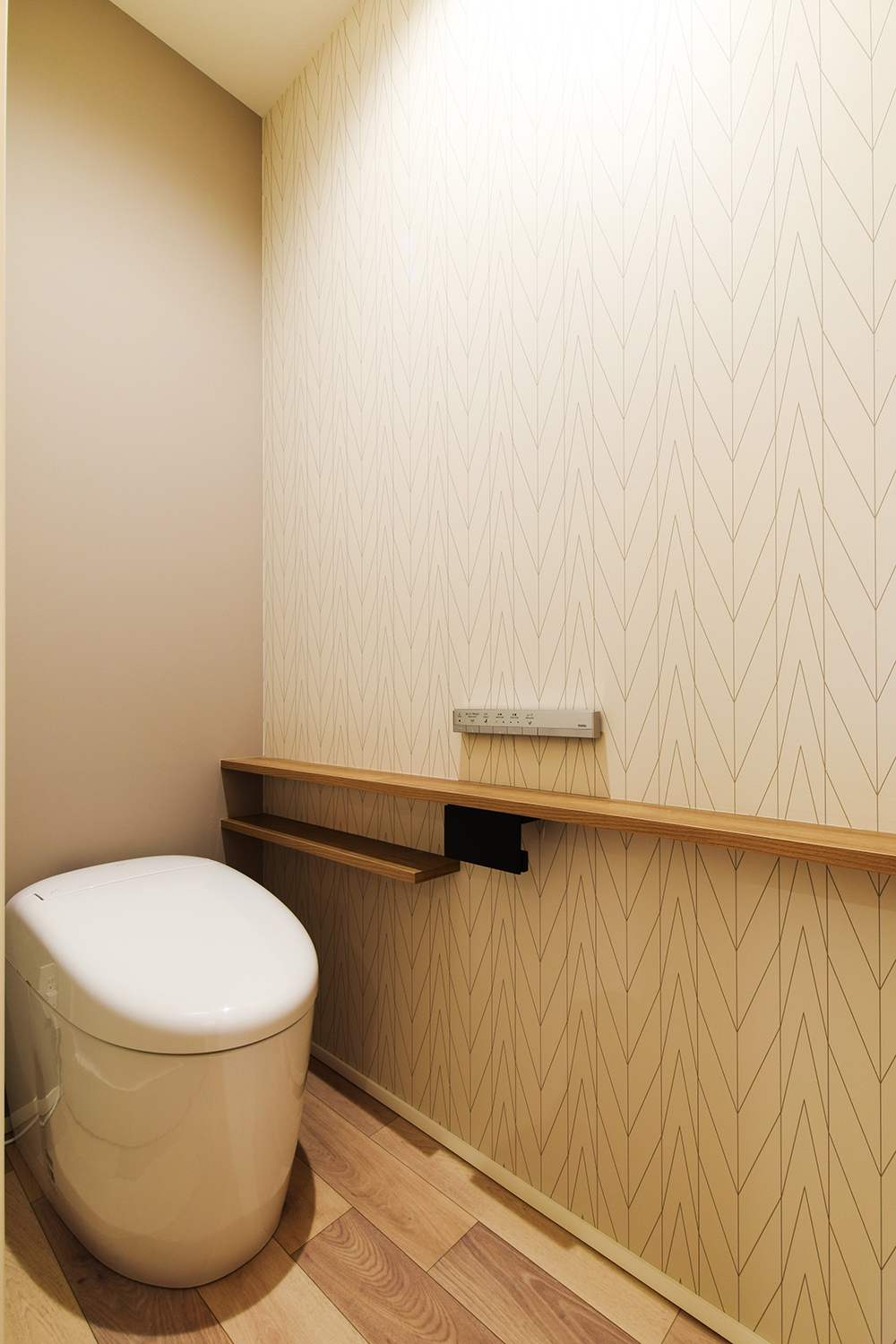 上品なヘリンボーン柄のクロスがアクセントになったトイレスペース
