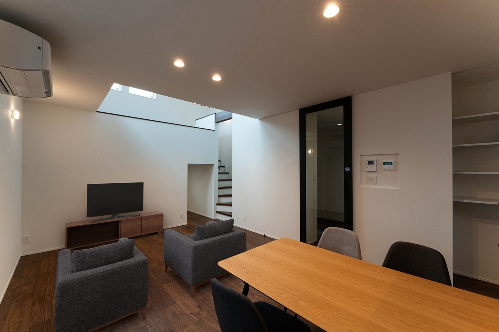吹抜けからの自然光が空間全体に広がり、開放感を感じさせる