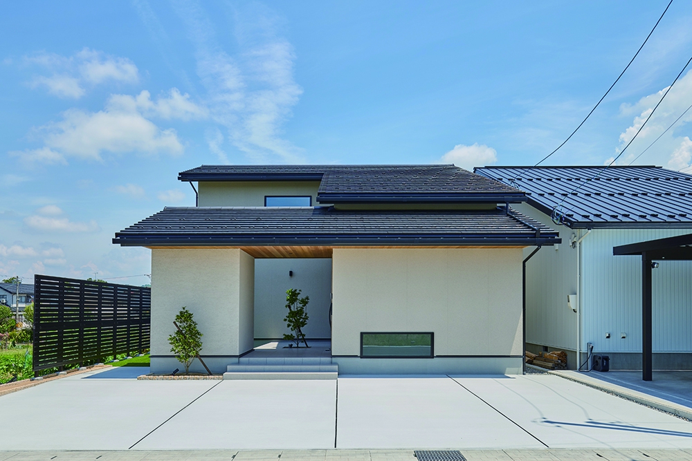 間口の広い外観に瓦で大屋根デザインの外観を設計、和風モダンに仕上げました。