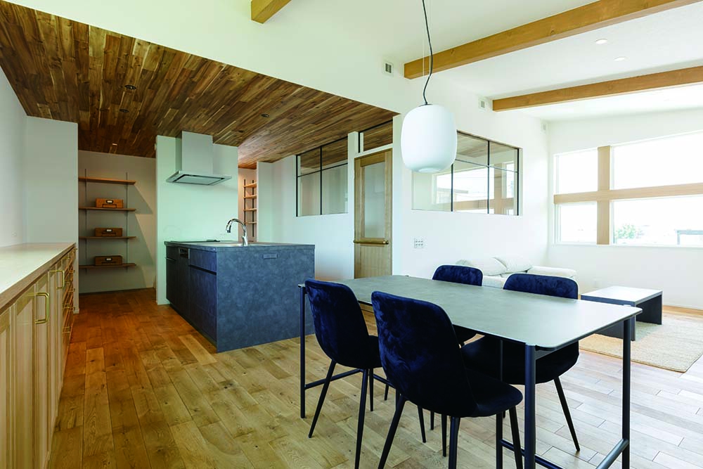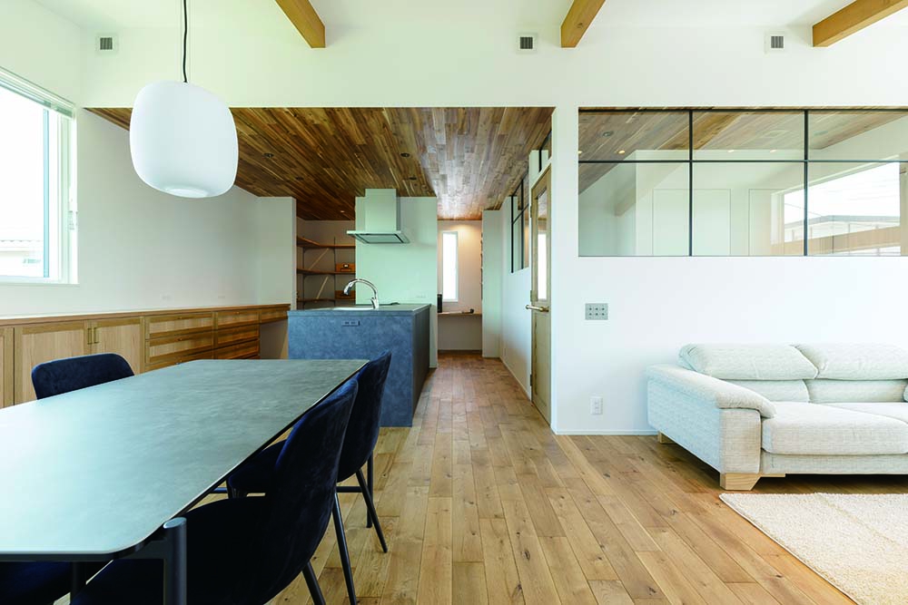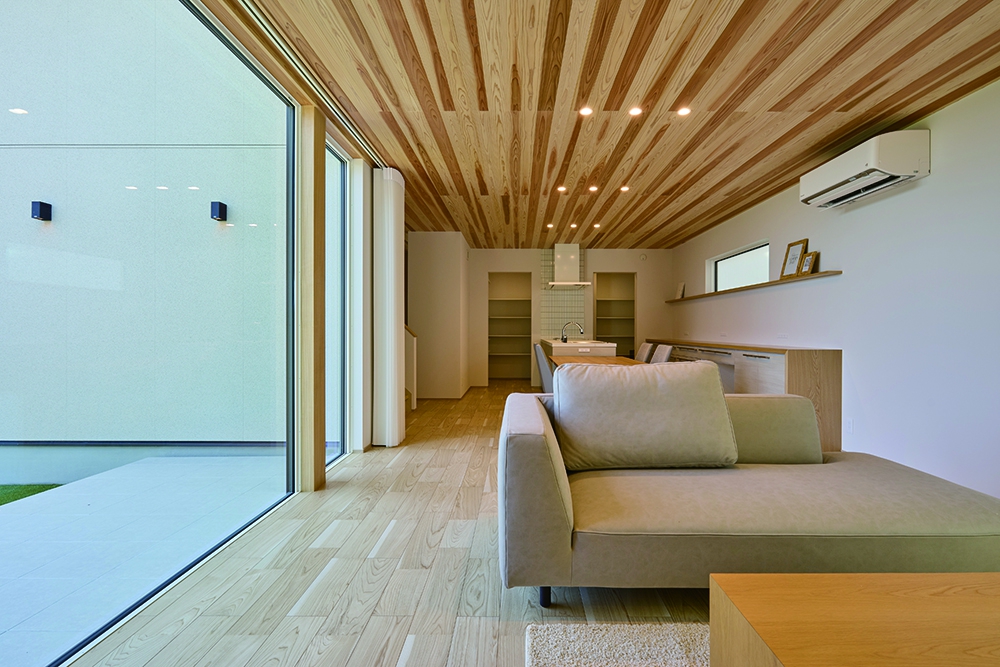 LDK空間の天井を杉板でデザイン。温かみのある空間に仕上げました。