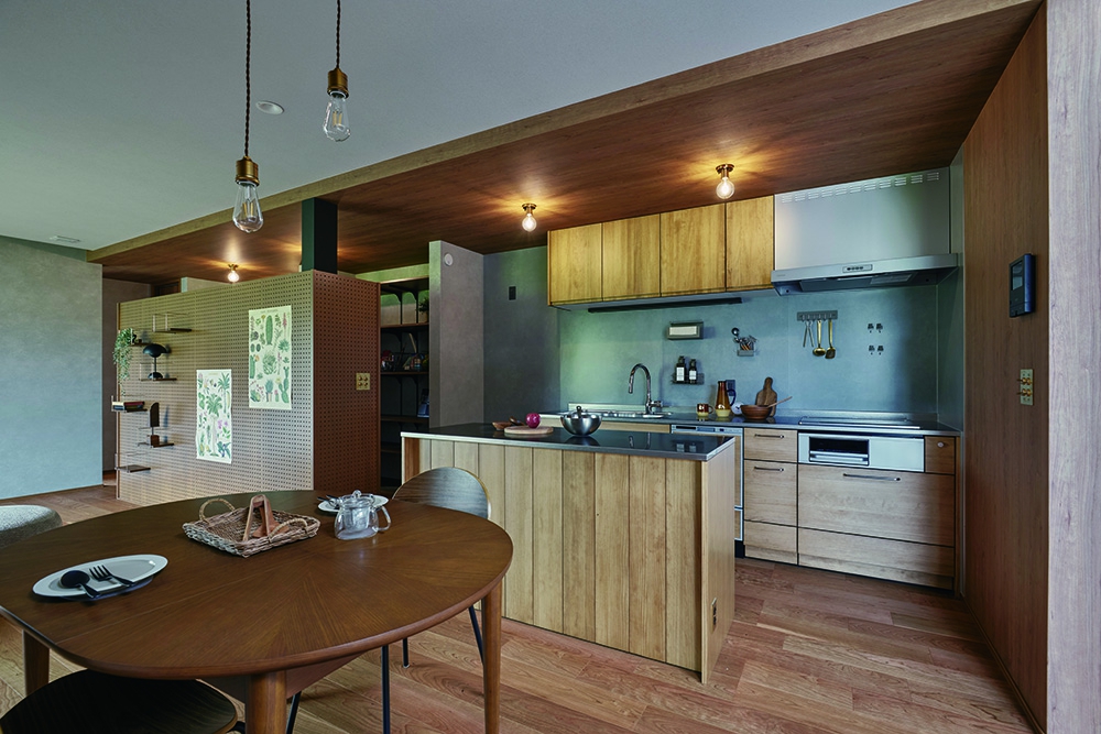 木やタイルの素材を組み合わせたオリジナルのインテリア。