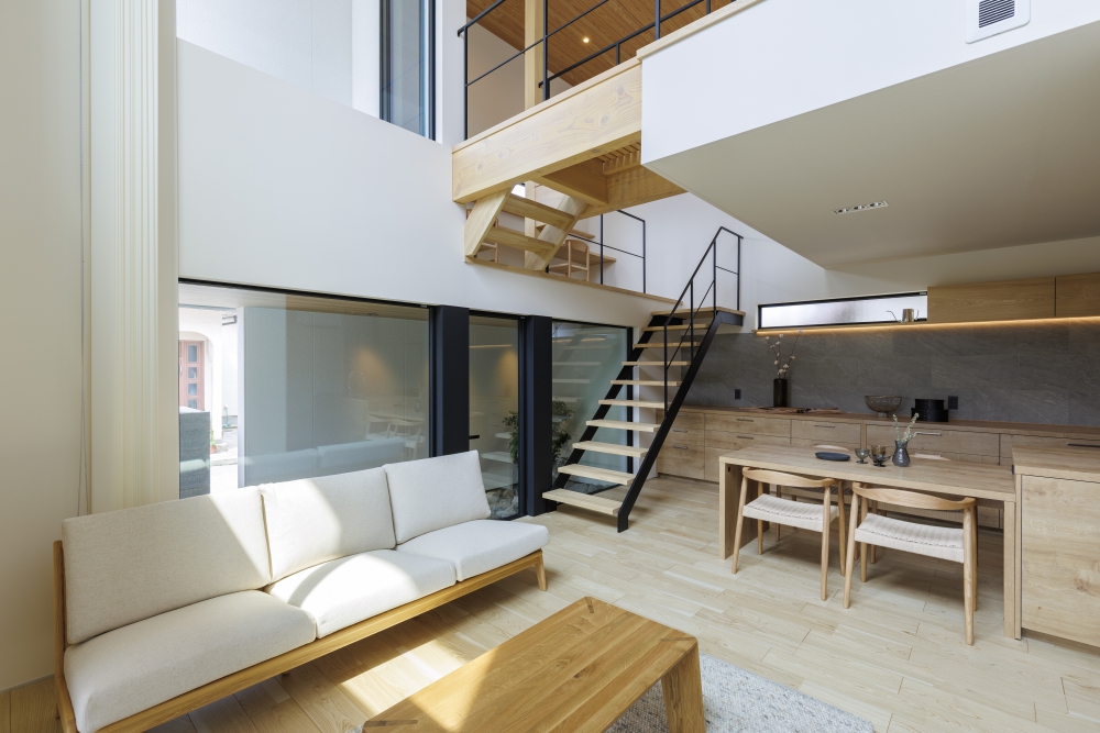 3m超の高天井リビングでLDK空間の広がりと明るさを演出