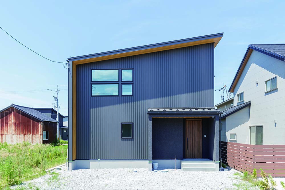 片流れの総2階風の外観でまとめました。正面の壁にはガルバリウムを貼り、スタイリッシュな外観に。