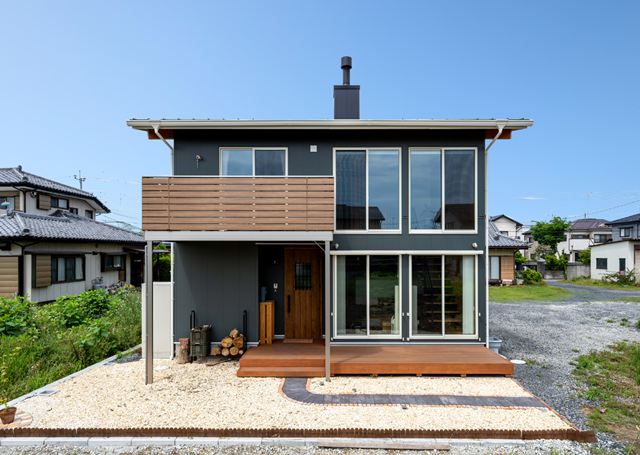 外観の半分を占める印象的な四連窓。薪ストーブの煙突も見えて、その中はどんな暮らしになっているのかと想像力を掻き立てられる。アルミのバルコニーは玄関の屋根にもなり、リビングと繋がる無垢のウッドデッキは使い勝手が良い。カッコいいだけでなく、暮らしをゆたかにするアイテムのチョイスはさすがだ