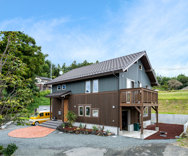 多くの商品ラインナップから、空間に無駄がなく自分達にちょうどいいサイズのCOVACO(コバコ)に決めた。周りの景観に溶け込む、木と黒の外壁を組み合わせたログハウス風の平屋での暮らし。LDKと外の両方から繋がるアウトドアストッカーでは、バイクガレージとして愛車のメンテナンスを楽しんでいる。ストーブの揺れる炎に癒されたり、ウッドデッキでコーヒーを飲んだりと、充実のセカンドライフだ
