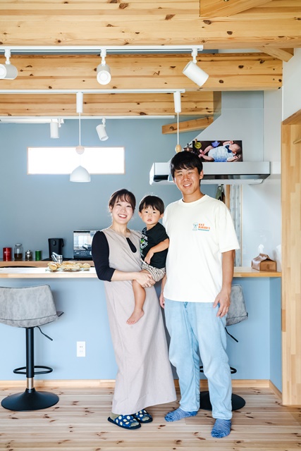思わず二度見したくなるような白と青のコントラスト。家づくりを考え始めた時からの憧れをカタチに出来た。ウッドフェンスの施工は同工務店に依頼したが、塗装を自分でやってみたい気持ちを担当に相談すると、サポートするのでDIYしてみたらと背中を押されチャレンジ。塗料の購入に迷い、ホームセンターから営業担当に電話してアドバイスを求めたのも良い思い出。「家づくりに参加出来て、一生残る思い出が作れた。全てのスタッフの対応が優しくて丁寧だったので、最後まで不安なく終えることが出来た」と奥様。感慨もひとしおだ
