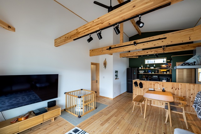 1.5階のLDKは吹抜けで、板張りの天井は標準仕様。自然素材のナチュラル感と見えるところ全部が板張りのリッチ感がたまらない。ソファにゴロンとして天井を見上げると「本当にこの家を建てて良かった」と心が温かくなるという。ヴィンテージテイストの塗装は落ち着いた雰囲気を漂わせ、ご夫婦の好きなインテリアによくマッチしている。モノが多い中にもこだわりを感じ、本当に好きなモノしか欲しくないという信念が伝わってくる