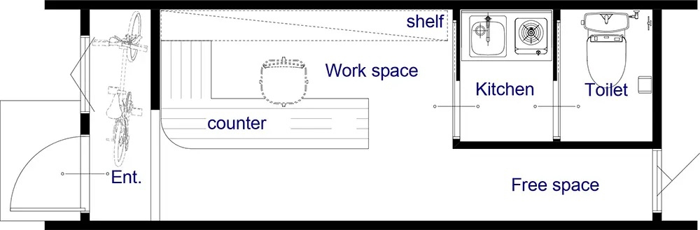 ワークスペース、キッチン、トイレ、シェルフスペース、自転車置き場、フリースペース