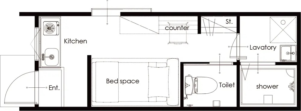 キッチン、シャワールーム、トイレ、ベットスペース