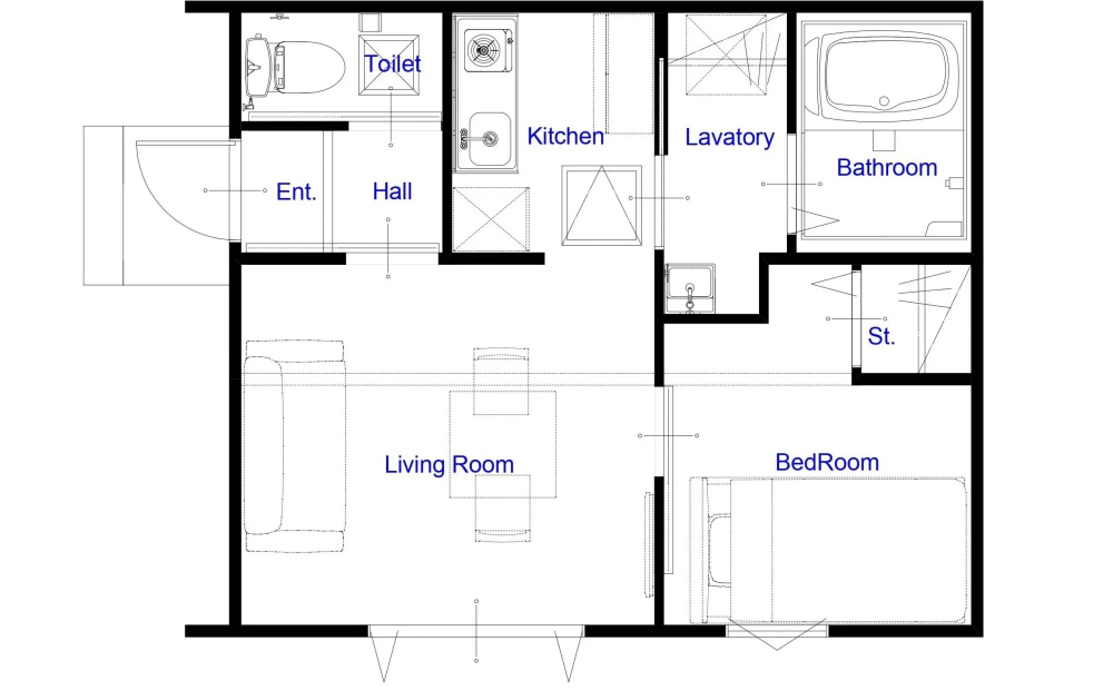 リビングルーム、キッチン、パントリー、ベッドルーム、トイレ、ラバトリー、シャワールーム