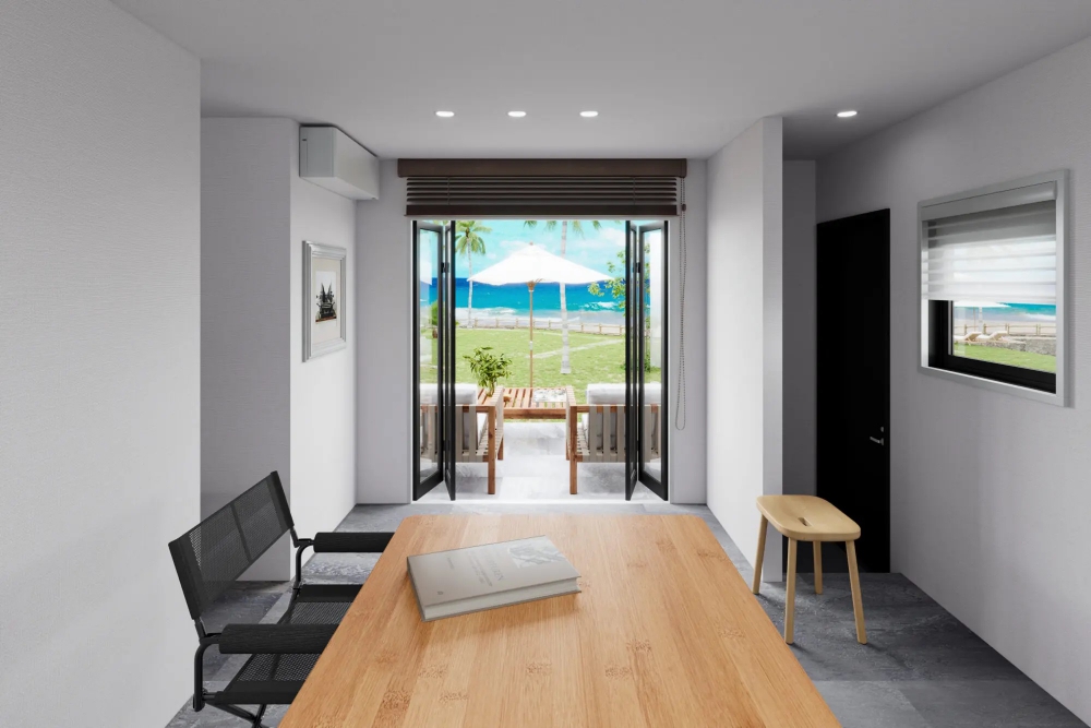 ●PRODUCT STORY(商品ストーリー)---海やグリーンを眺めながら 心癒される非日常の時間 ウッドデッキに出れば、視線の先に広がる自然。コンパクトな間取りの中でも、窮屈さを感じさせない開放感のある空間。