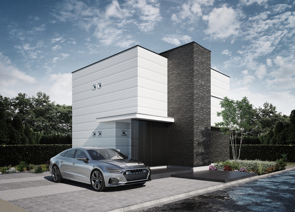 「どの街にもフィットするデザインにしたい」とオーダーしたモノトーンのスタイリッシュな外観。道路側の1階部分に窓をほとんど設けていない、プライバシー重視のデザインでもある。