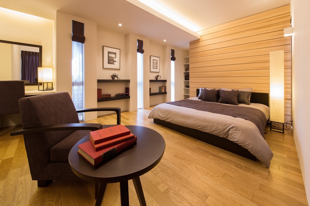 Hさまの書斎として使用している納戸を通って主寝室に入る設計になっているので、Hさまが遅くまで書斎で作業をしているときも声がかけやすく、自然にコミュニケーションがとれる。主寝室のウォークインクロゼットは2.6帖と衣類などをたっぷりしまえる広さである。