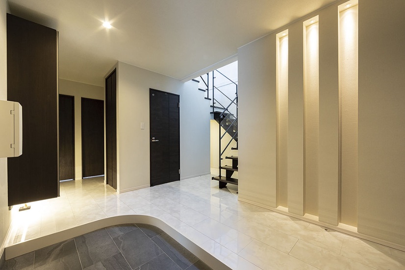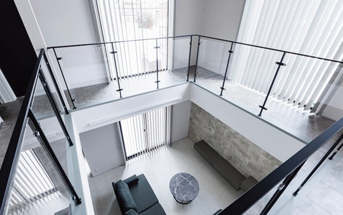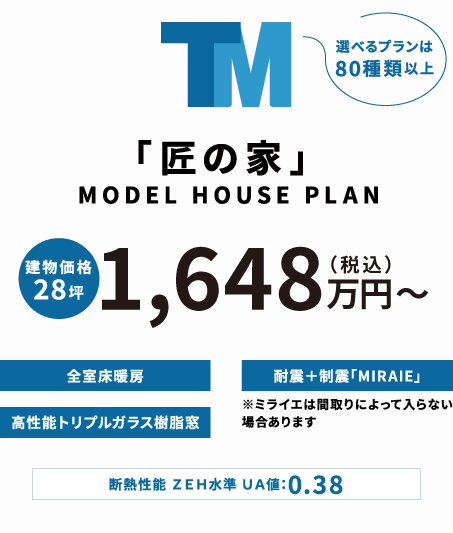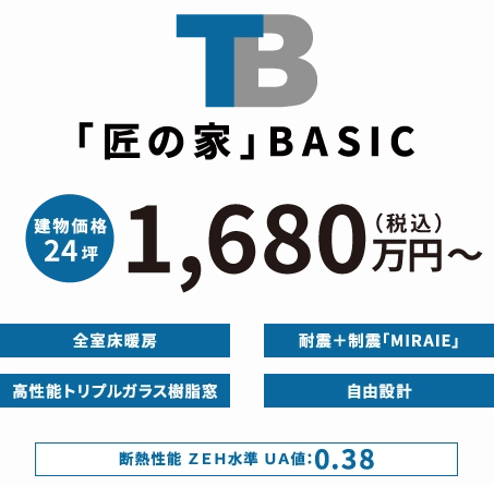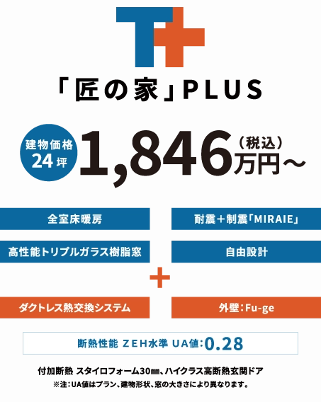 壁、床、天井、開口部(窓、玄関)に断熱性が高く厚みのある建材を使用し、ZEH水準を超える断熱性能を実現。「匠の家」BASICはUA値0.38(断熱等性能等級5)、「匠の家」PLUSはUA値0.28(断熱等性能等級6)が基準です。