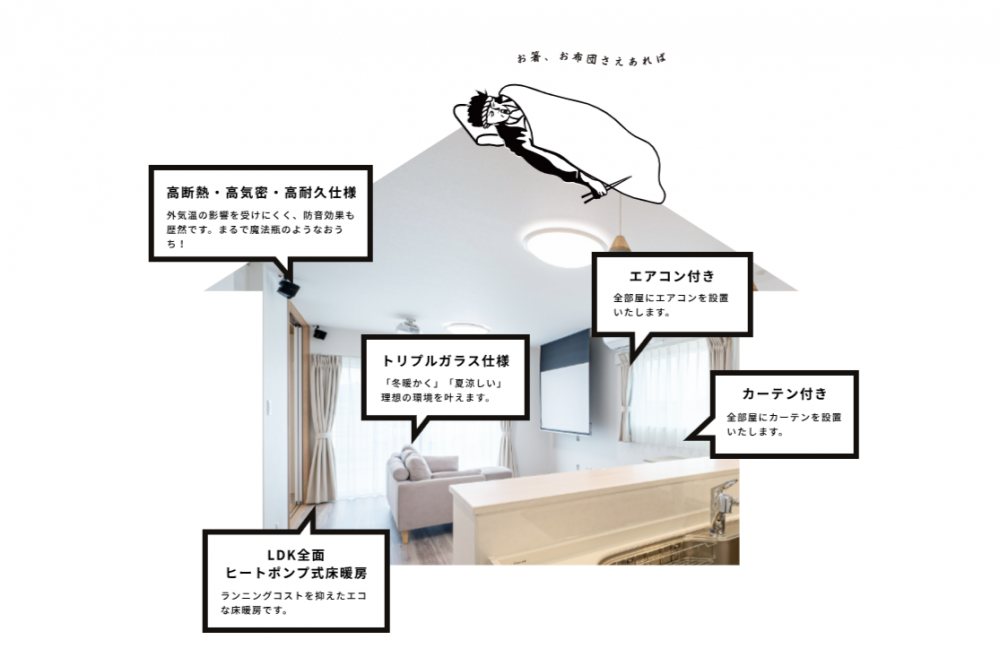 | こだわりポイント | まさか その1「家を守る工務店」 まさか その2「住人十色の本格注文住宅」 まさか その3「太陽光を設置しないと損」 まさか その4「ハンドメイドで家具を造作」 まさか その5「布団ひとつですぐ住める」 |