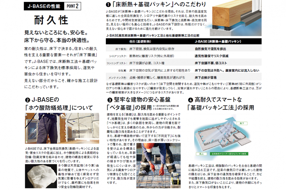 | アフター保証 | ◆安心、安全な暮らしを実現するために、快適な住まいをサポートします。 J-BASEでは、日々の生活において突然発生する様々な不具合や、メンテナンス部品の交換など、住まいに関するお悩み事やトラブルに迅速に対応しています。 専用のお問い合わせフォームやコールセンターをご用意していますので、お困りの際はお気軽にご連絡ください。 ◆株式会社日本住宅保証検査機構の「わが家の保険」に全棟加入 お引き渡し後の10年間に、万が一、品格法上の「瑕疵」が発生した場合は、「日本住宅保証検査機構」がその費用を保証。 建築会社が倒産しても長期保証が継続され、お客様の安全・安心を守ります。 J-BASEでは、瑕疵担保責任保険(通常10年)の延長保証制度を導入し、お客様に[最長25年の保証]を提供しています。 ◆シロアリ10年補償 基礎パッキン工法による床下換気の導入で、床下全域を乾燥させ、シロアリ被害を効果的に予防します。 これによって住宅の耐久性を向上させるだけでなく、薬剤に頼らず自然の気流を利用するため、住む人や環境に悪影響を与える心配がありません。 万一、シロアリ被害が発生した場合は、Joto保証約款に基づき補償いたします。 ◆完成保証 J-BASEでは、万が一施工が途中で継続できなくなった場合にも、住宅を最後まで完成させるための 「完成保証制度(任意加入)」 をご用意しています。 この制度は、「株式会社日本住宅保証検査機構(JIO)」の「完成サポート」に申し込みをしていただく事で、工事途中での事業停止・施工中断などのリスクに備える商品です。 対象住宅・支払条件・加入時期など所定の条件がありますので、ご契約前に担当スタッフまでご相談ください。 ◆住まいを支え続けるための信頼の定期点検サービス オーナー様の暮らしの安心を守るために、1年・2年・10年の計3回、無料定期点検を実施しています。 点検の際には、幅広いメンテナンス知識を持つ専任のスタッフが、オーナー様のライフサイクルに合わせたお手入れアドバイスも行っています。 ◆設備機器延長保証 毎日使う住まいの設備機器に、安心をもうひとつ。 「住宅設備機器延長保証サービス」によって、システムキッチン・システムバス・給湯器などの主要設備機器を、メーカー保証終了後も最長10年間の無償修理または新品交換して暮らしの安心を支えます。 当社で取り付けた、住宅設備機器、空調機の主に通電部の故障が対象となります。 物理的な破損等は対象となりません。詳しくはお問合せください。 |
