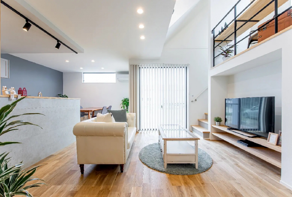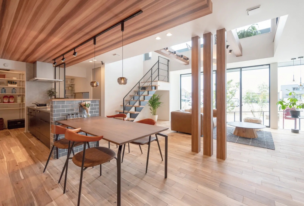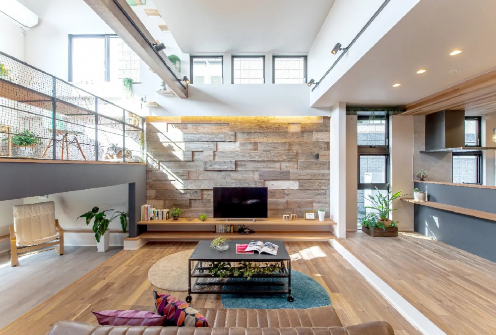 吹抜・ハーフ吹抜・床下げ・スキップフロア・スキップ収納が織りなす、デザイン性の高い解放的なリビング。足場板を使ったアクセントウォールやあらわし梁が、より一層デザイン性を高めています。