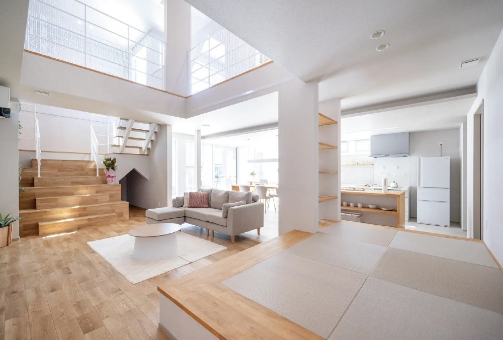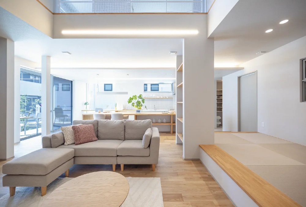 リビング側から見たLDK全景。リビングのそばには小上がりのタタミコーナーがあり、ゴロンとなりたい時に大活躍。上部は吹抜となっており、開放感あふれる空間となっています。